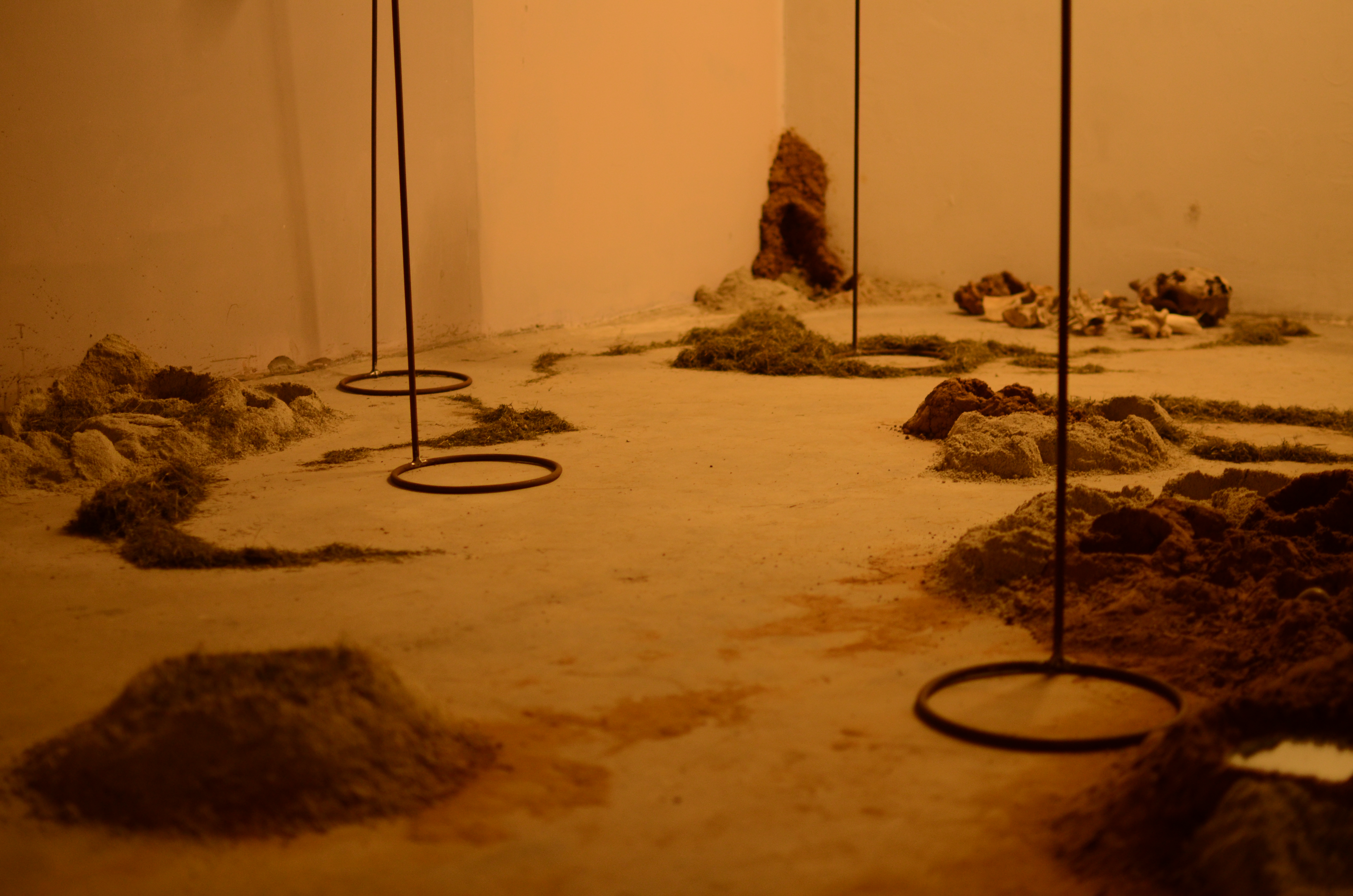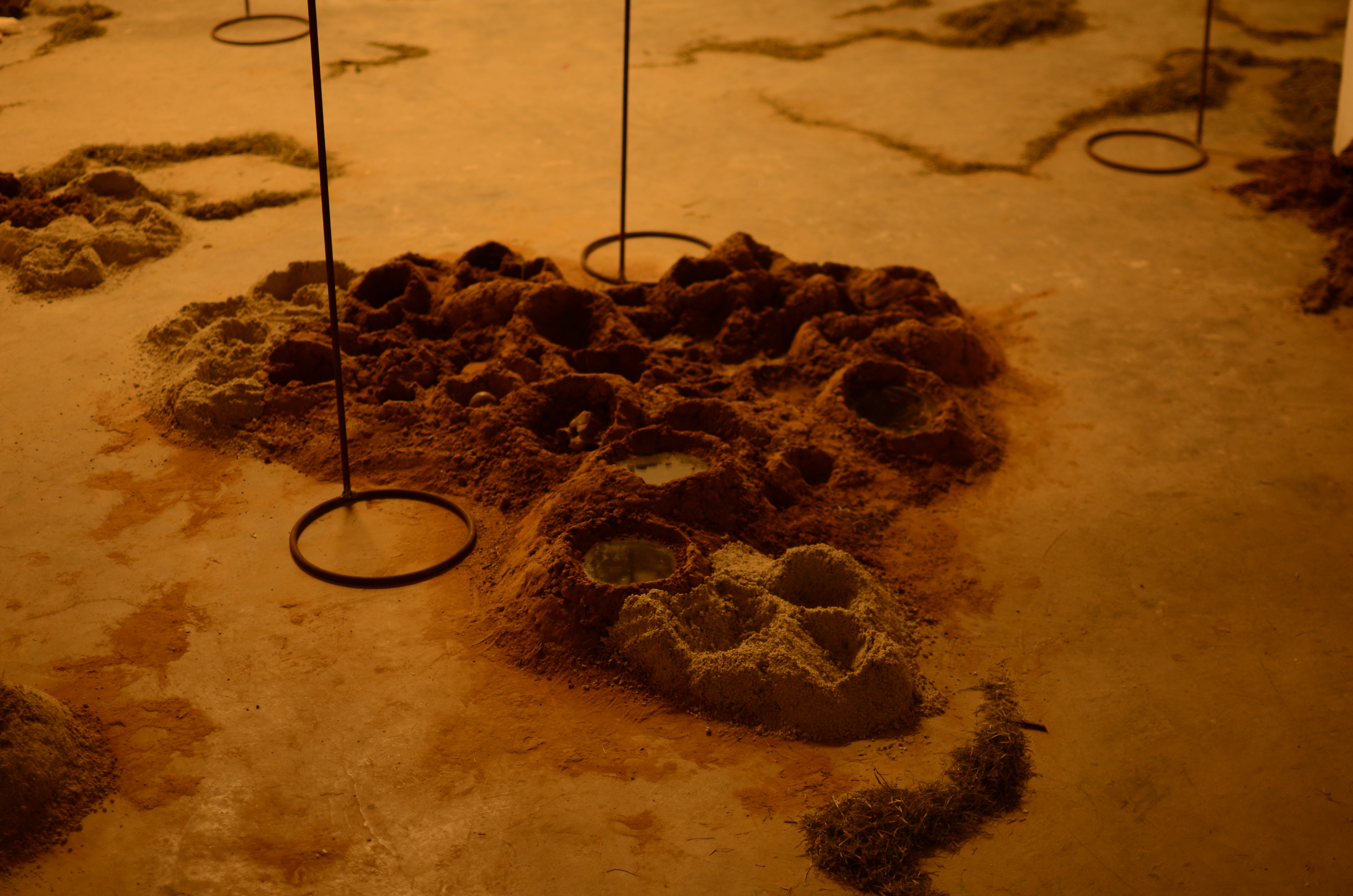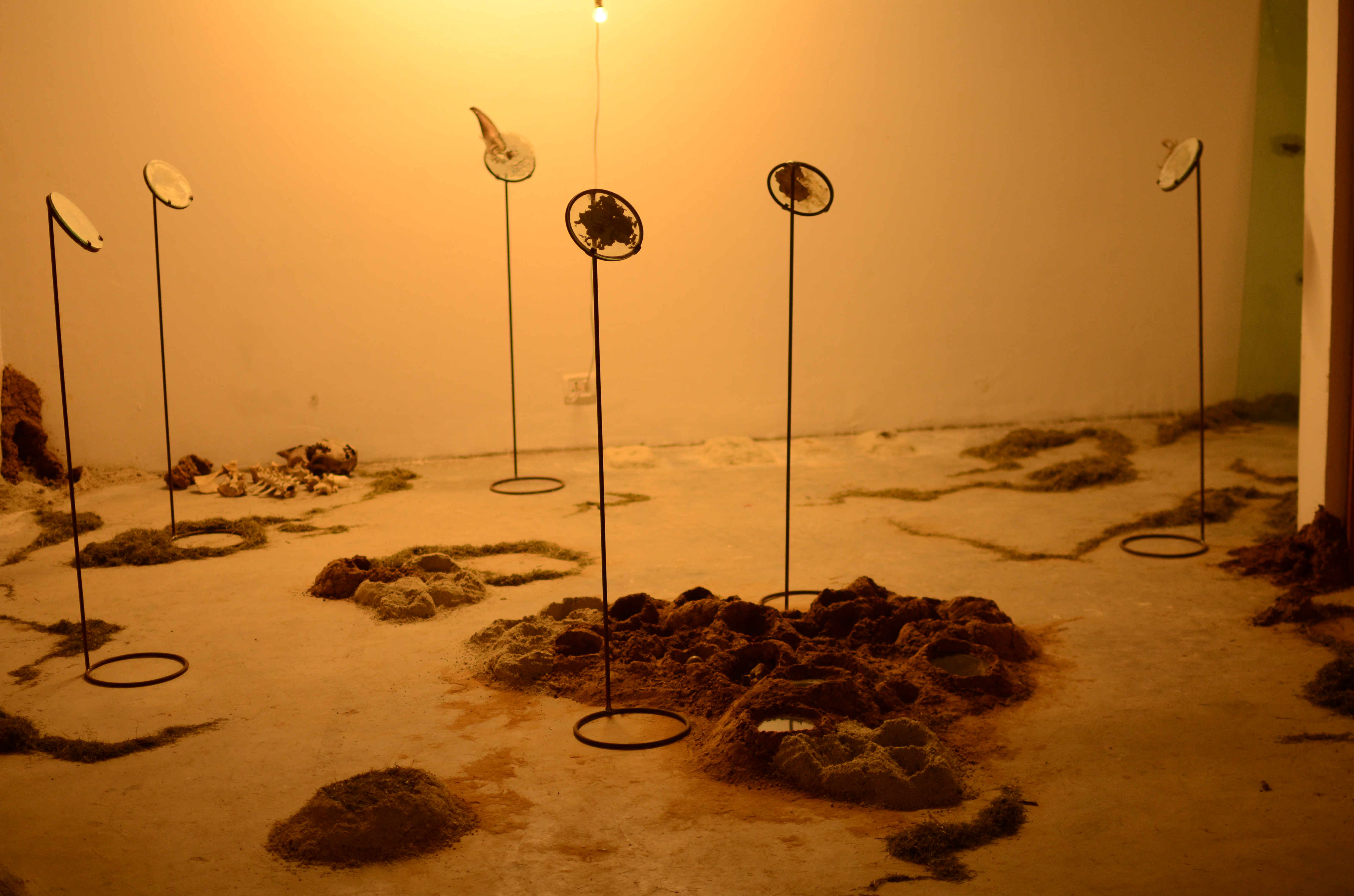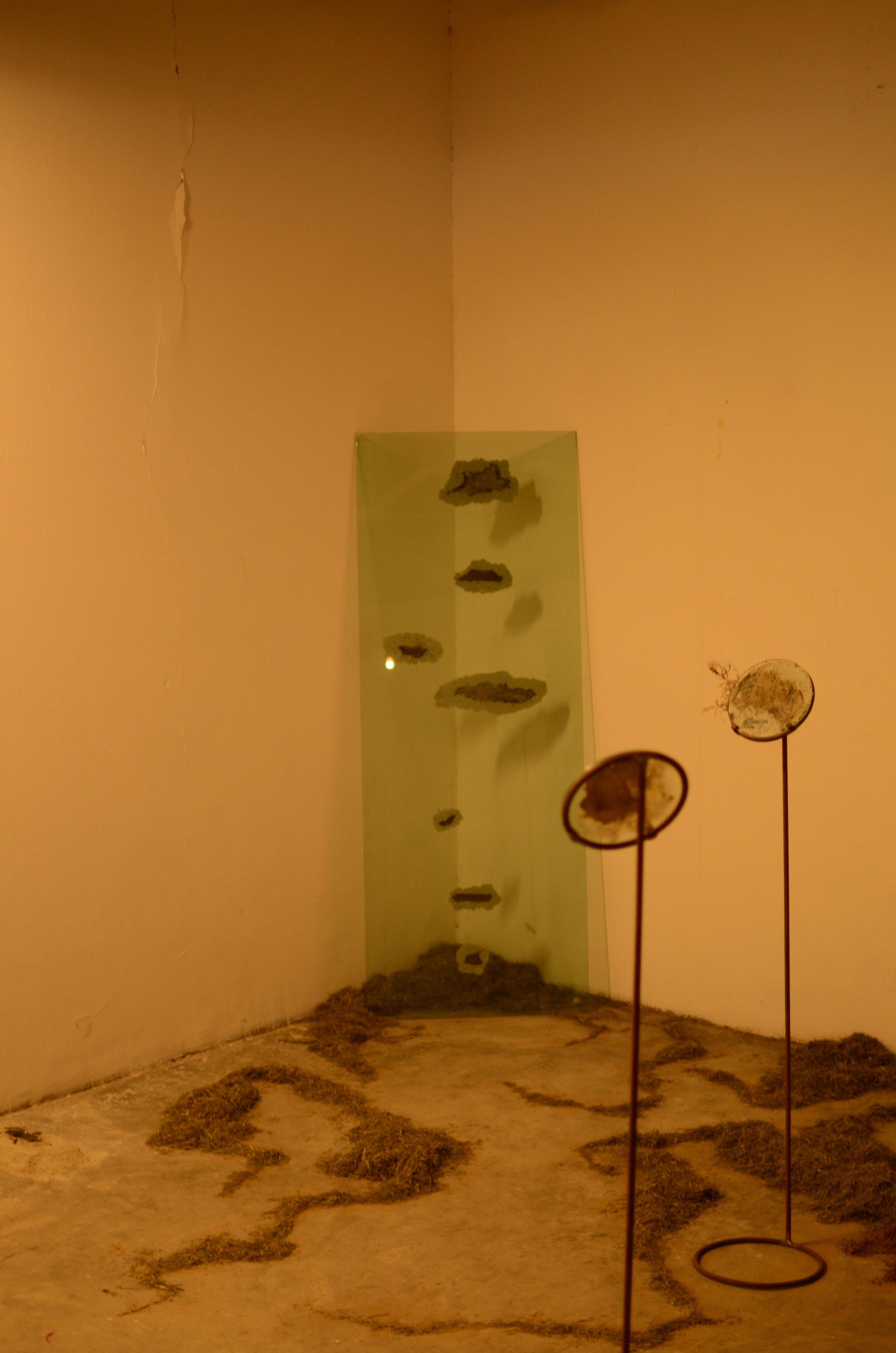This installation was made of soil formations, some of which held the ash of burned leaves. These were covered with glass as if to preserve the ash. Collected objects were combined with poetry and fixed to circular glass surfaces with papier mache. These circular pieces of glass were propped on iron stands, to appear as though they have been lifted off the ground. The stands were placed around the room, and the trails of grass and soil on the floor guided the viewers’ movement in the room.