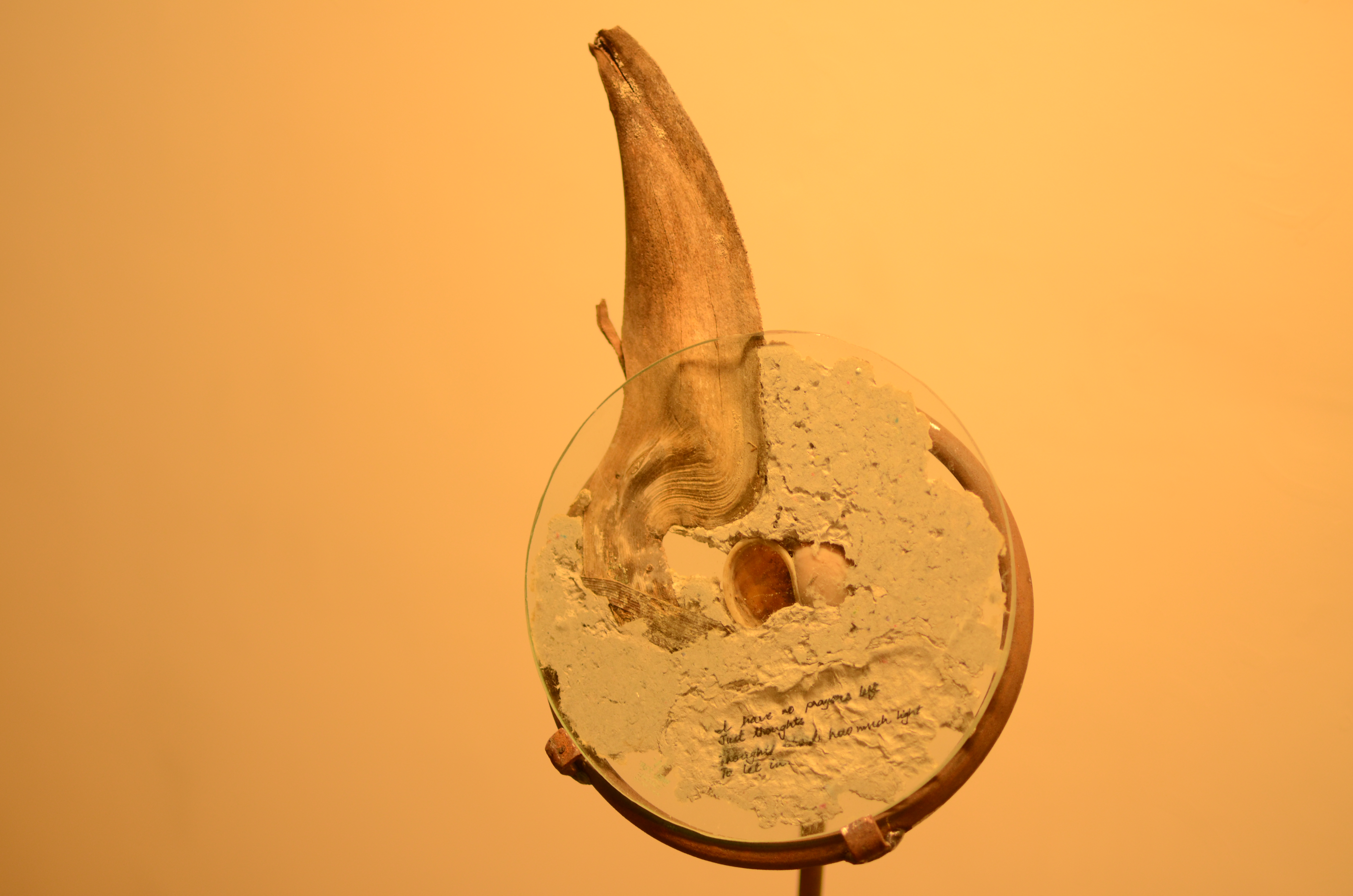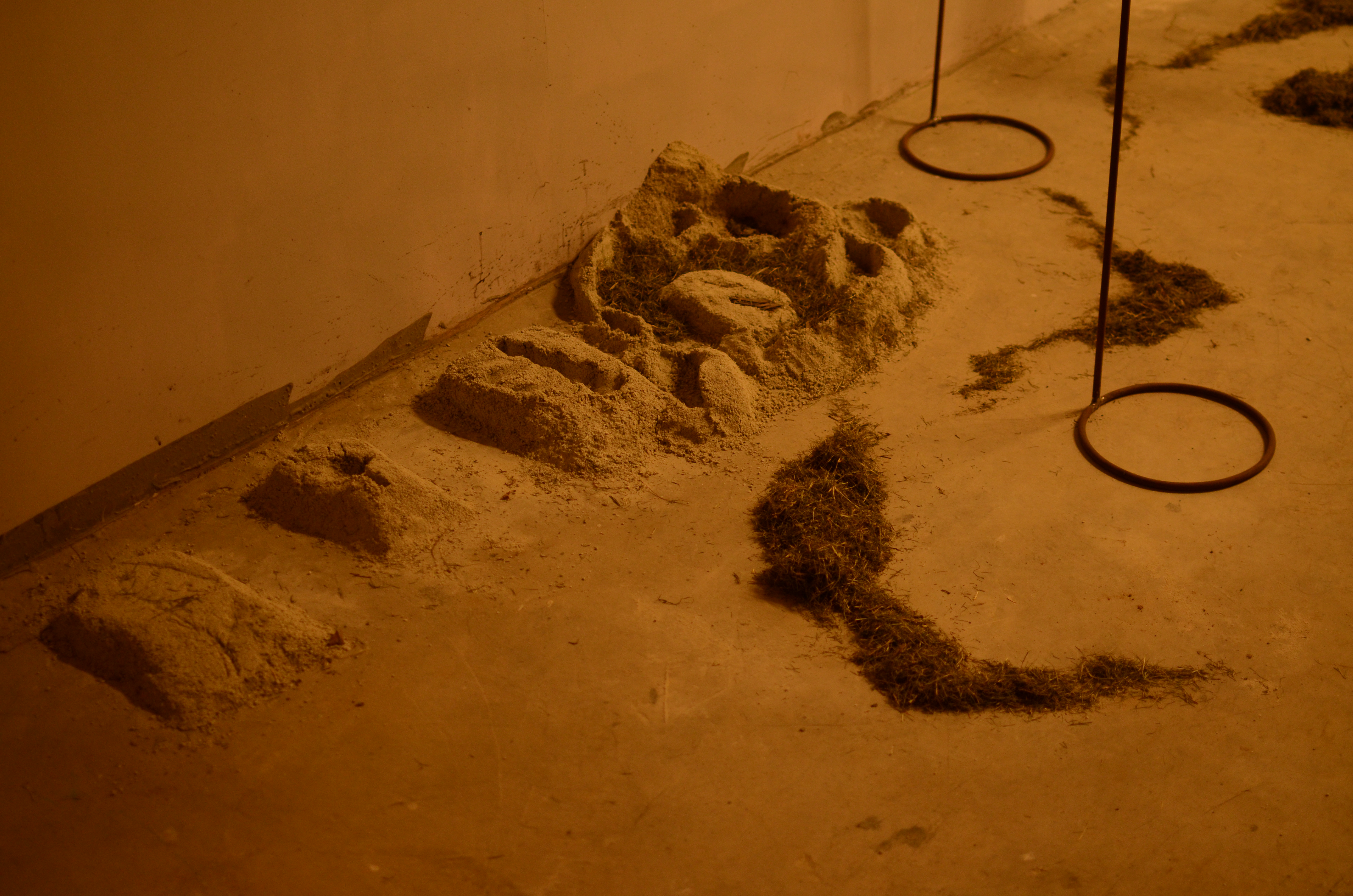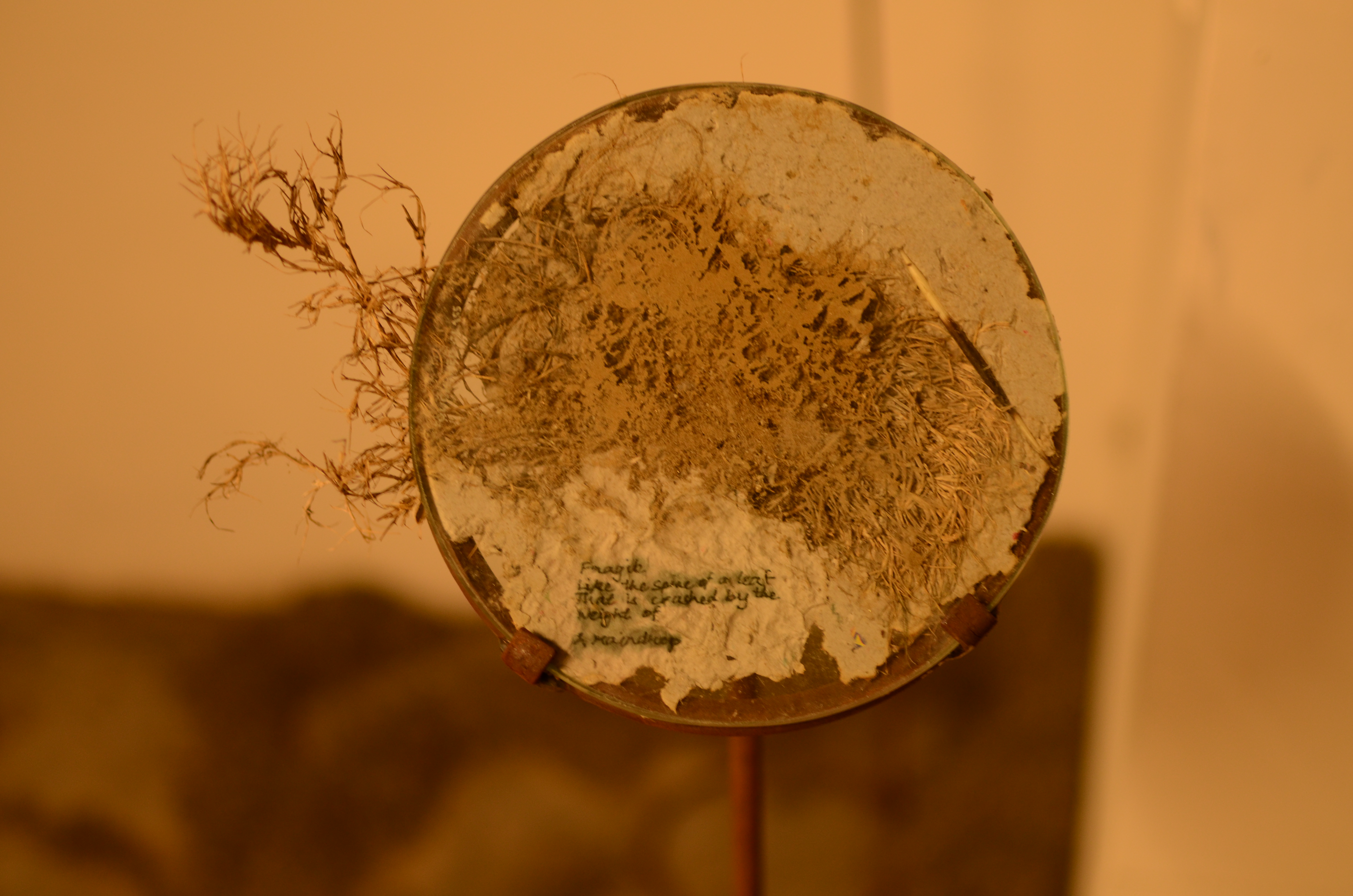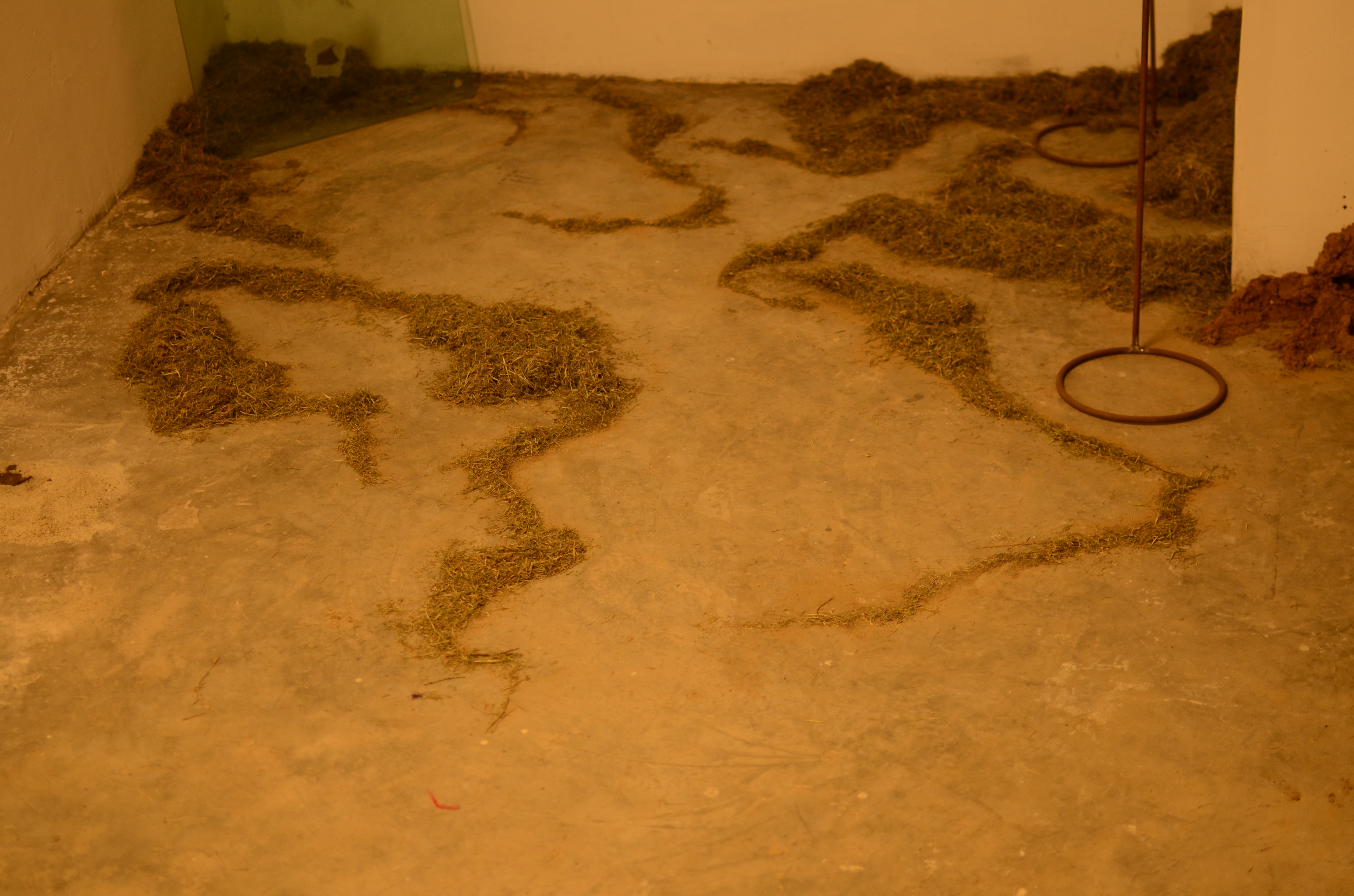This installation was made of soil formations, some of which held the ash of burned leaves. These were covered with glass as if to preserve the ash. Collected objects were combined with poetry and fixed to circular glass surfaces with papier mache. These circular pieces of glass were propped on iron stands, to appear as though they have been lifted off the ground. The stands were placed around the room, and the trails of grass and soil on the floor guided the viewers’ movement in the room.