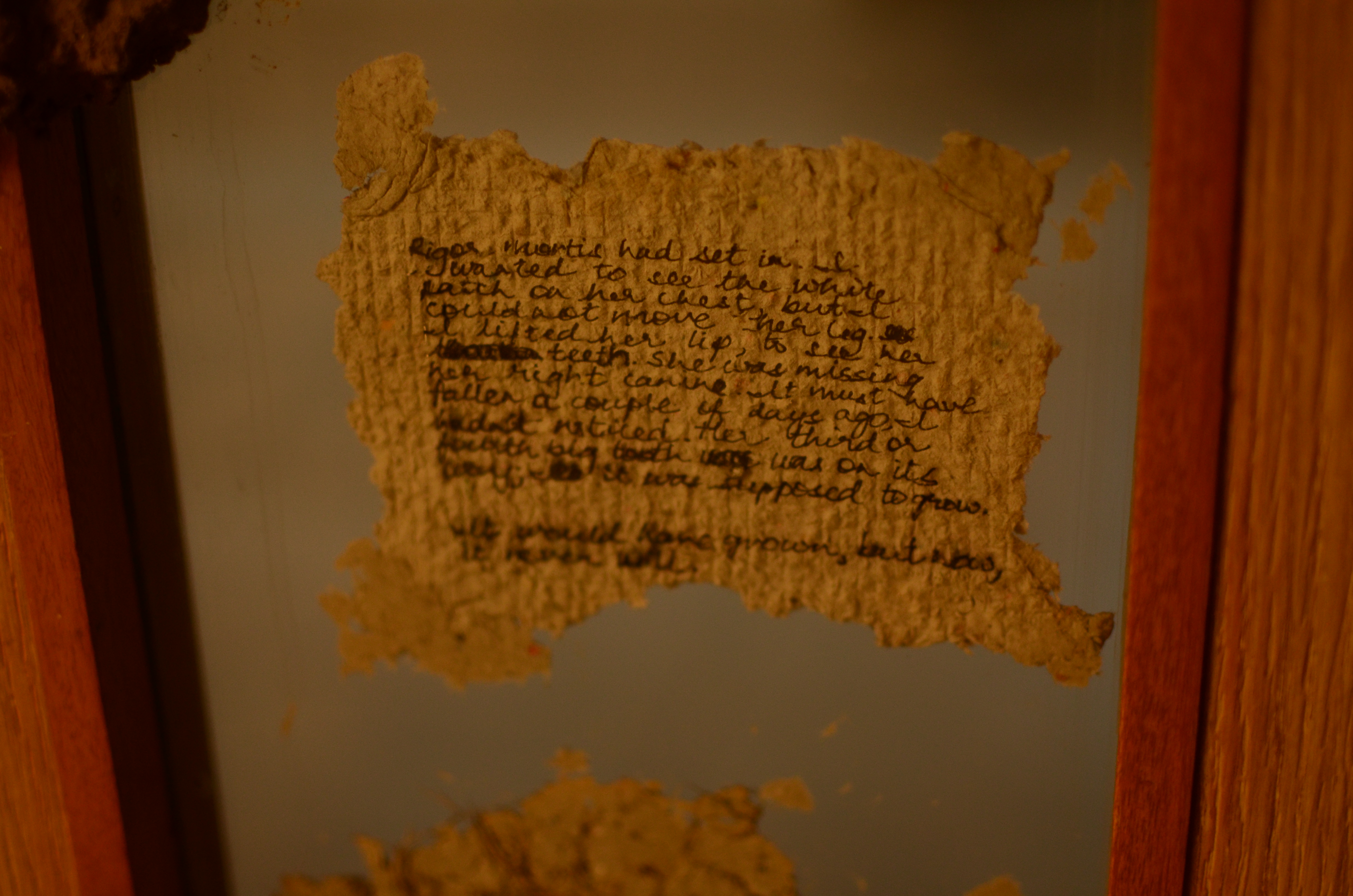 Central Text: Rigor mortis had set in. I wanted to see the white patch on her chest, but I could not move her leg. I lifted her lip, to see her teeth. She was missing her right canine. It must have fallen a couple of days ago, I hadn’t noticed. Her third or fourth big tooth was on it’s way; it was supposed to grow.
