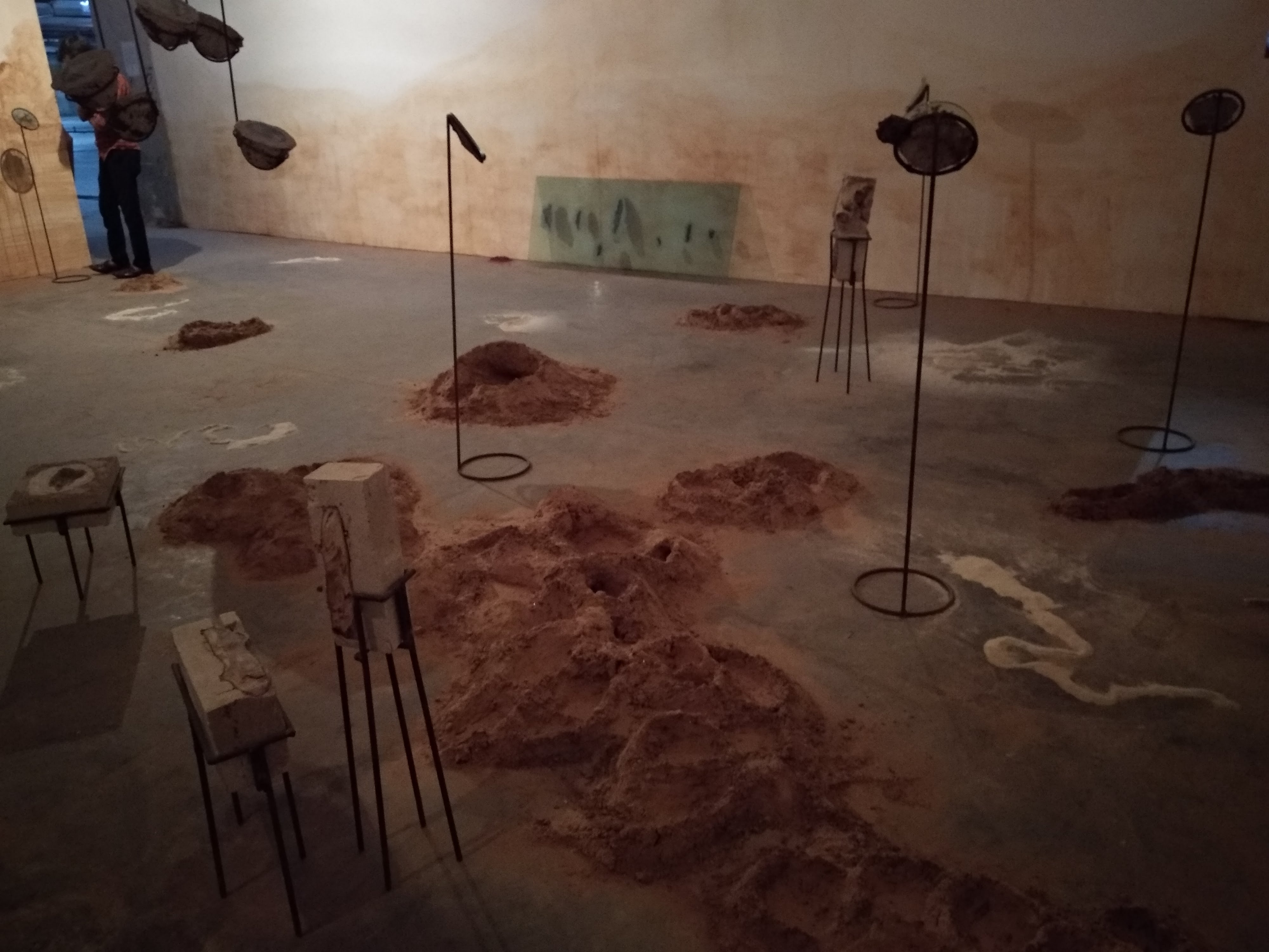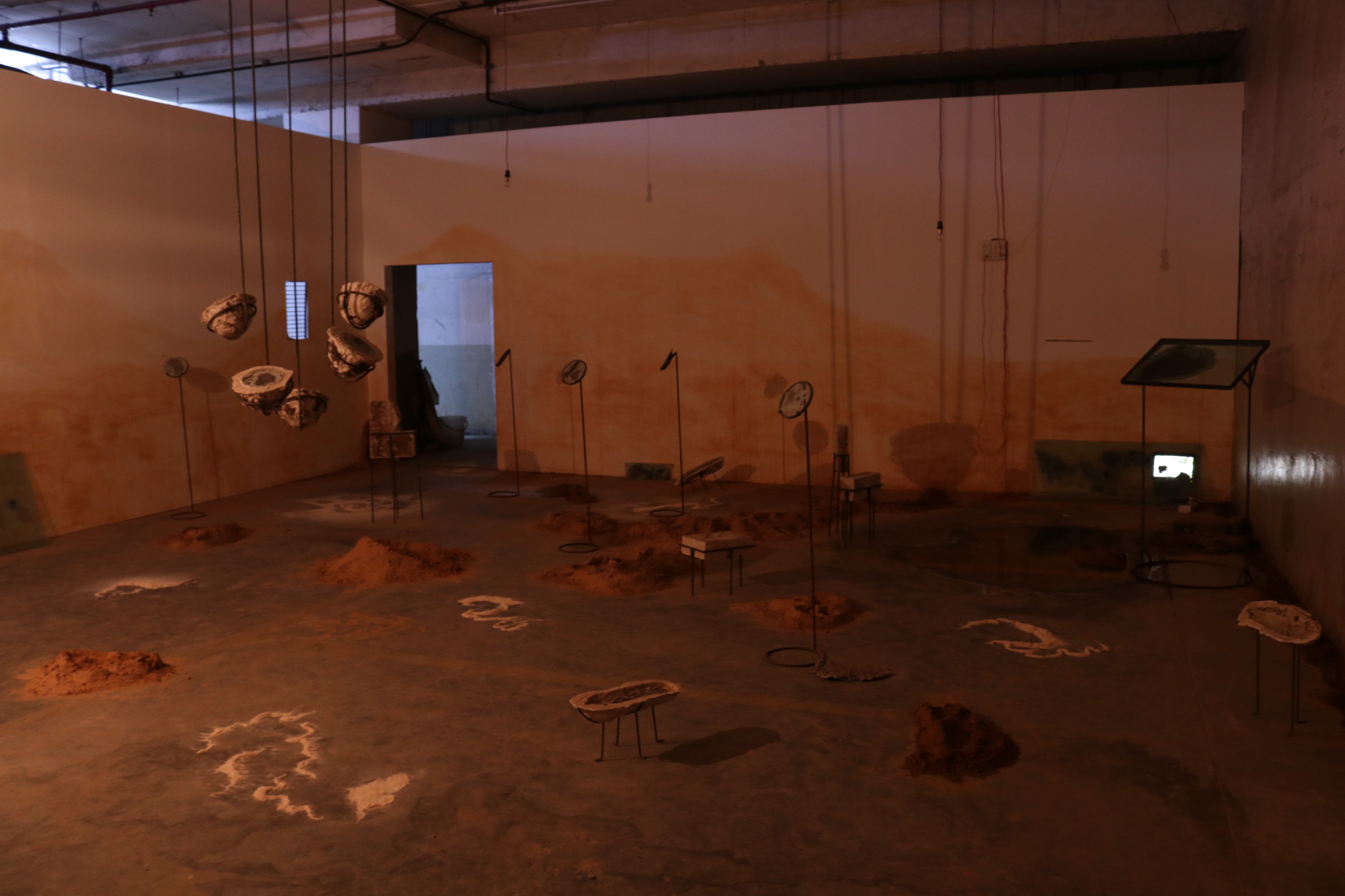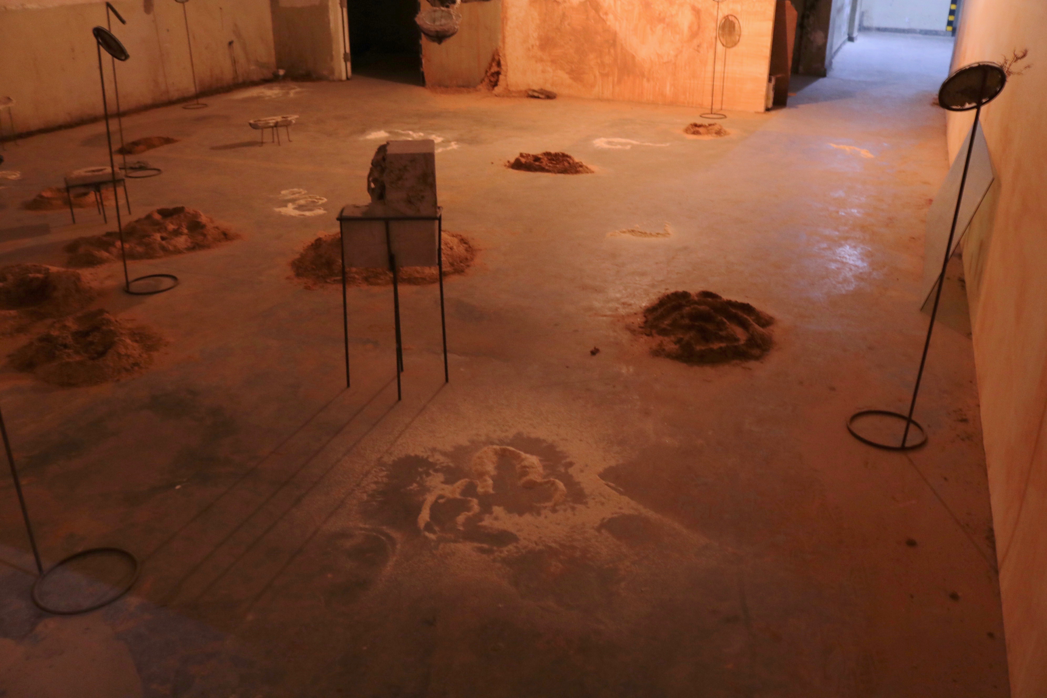 Soil was collected from the banks of the Yamuna to recreate mounds as ineffective pockets of refuge. On a small screen is a video of ants emptying out a crevice between two tiles gravel by gravel, and spread out around the room are plaster moulds of collected objects lifted off the ground and placed on custom made iron stands.