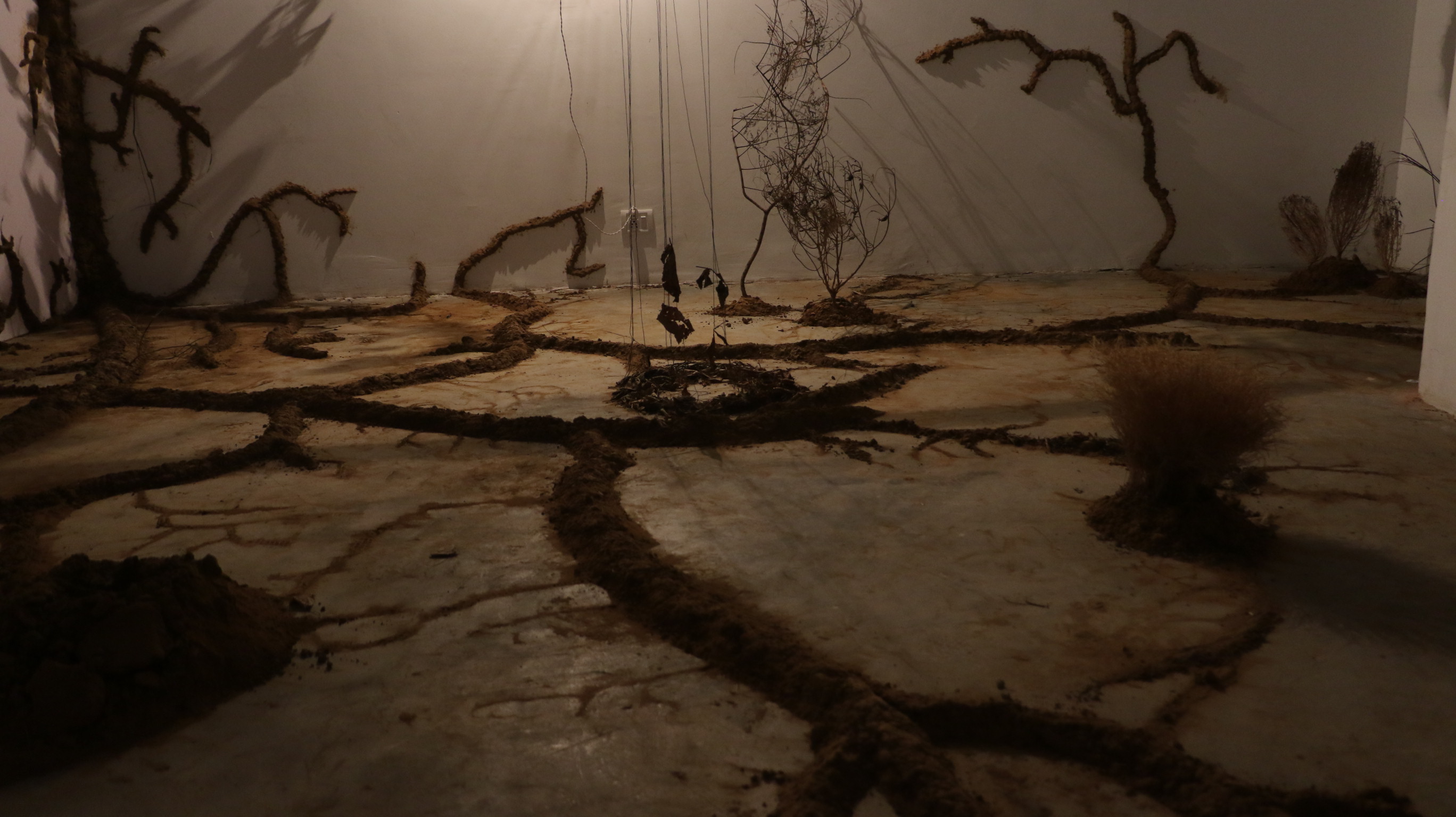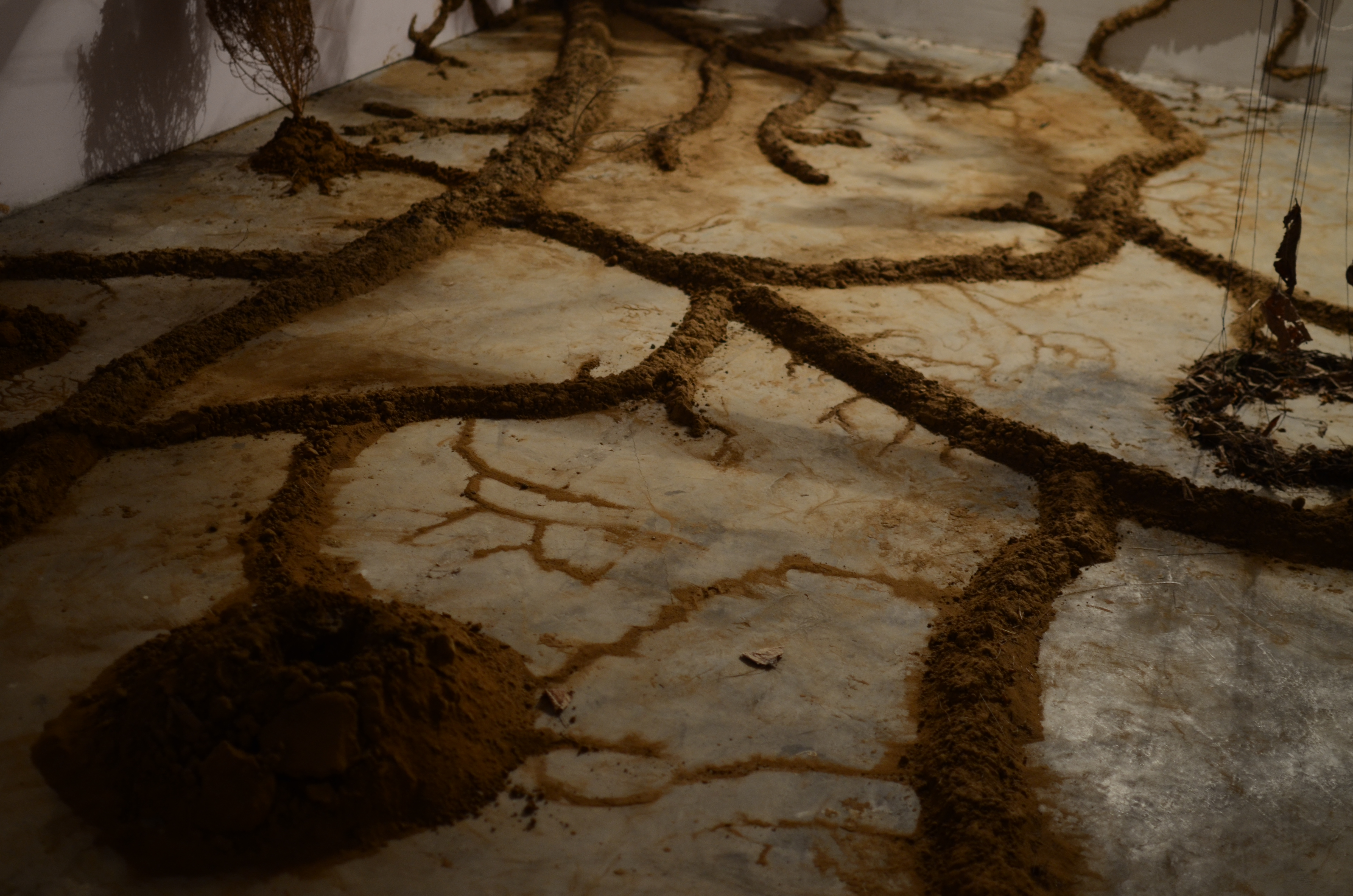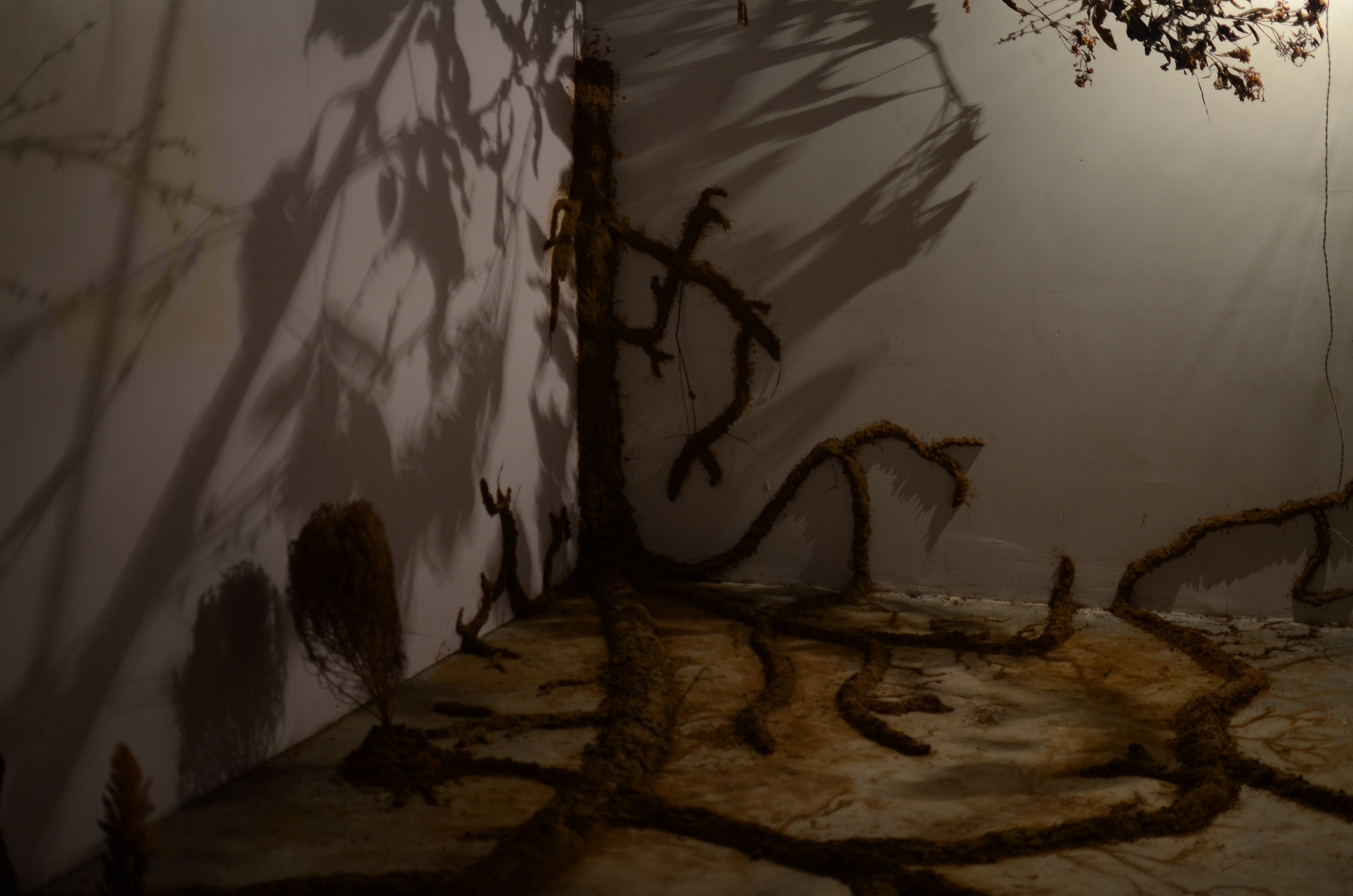 This installation used soil collected from the construction of a highway, dead plants that had been uprooted and discarded on campus, and dried leaves that had been swept into piles. It borrowed from the idea of the sacred grove, a grove of palm trees on campus, that has been protected by the myths surrounding its sanctity by the locals in the area. Through this installation, the attempt was to evoke the atmosphere of the grove while also trying to create a garden of dried, decaying objects.
