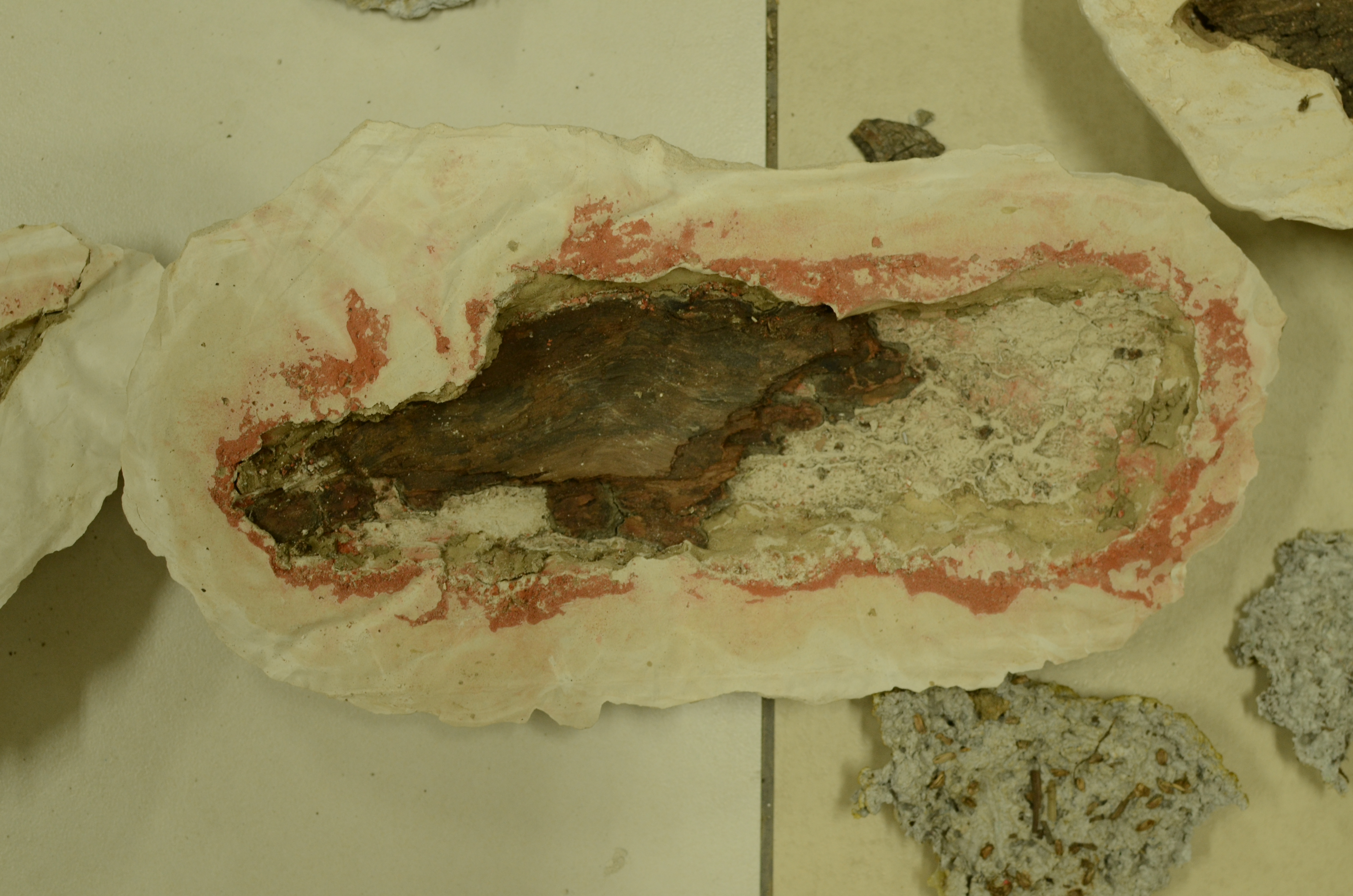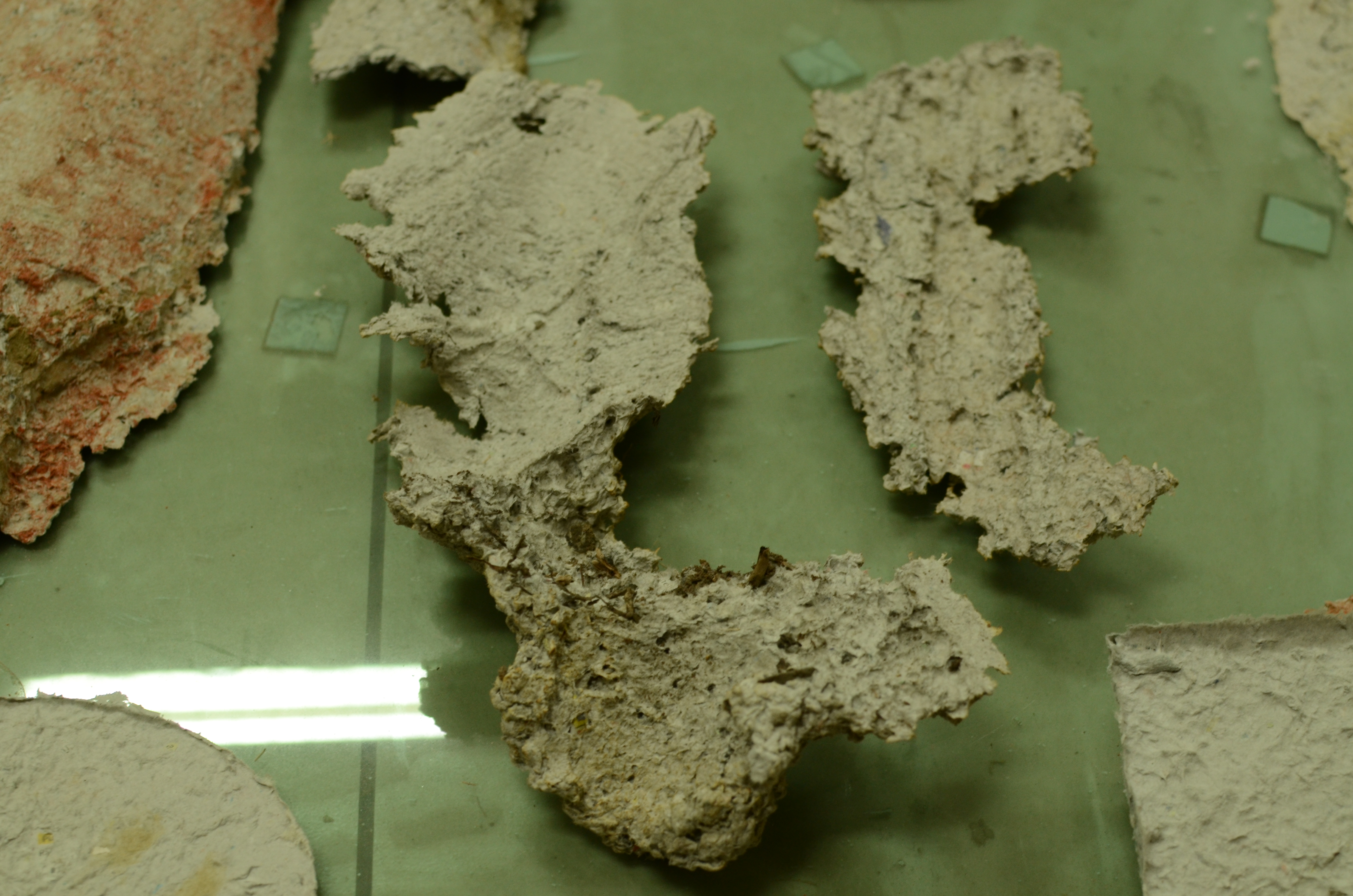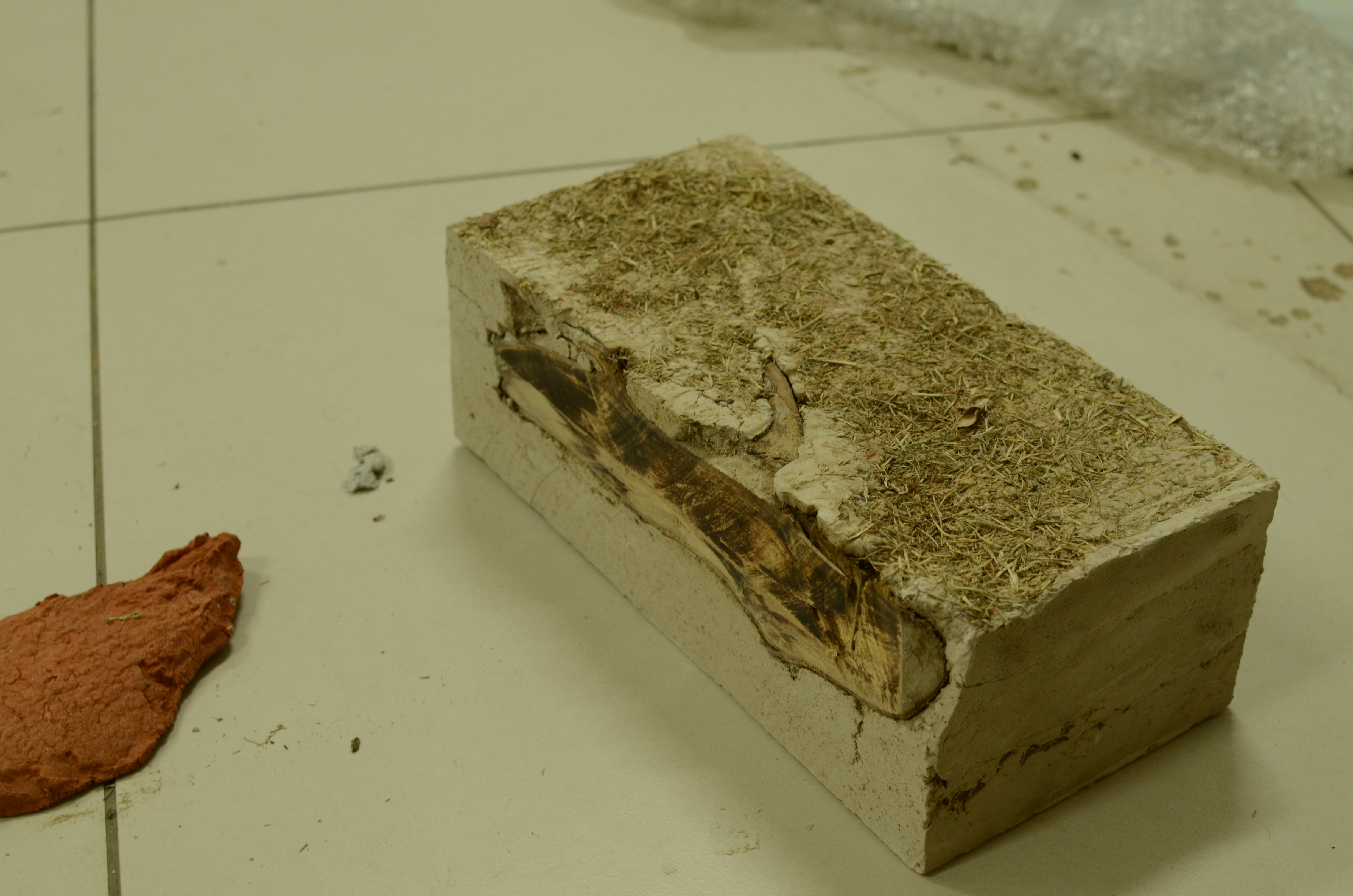 Plaster and paper maché moulds were made using tree bark found in a cemetery in Meerut, and the Shiv Nadar University campus. Parts of the bark remain embedded in some moulds to clarify the association between the imprint and its source. In one of the pieces, a block of plaster mixed with cut grass was made over a piece of cut branch that had been discarded on campus. Once the block had completely dried, it began to absorb the moisture in the branch, forming a crack. The block was cut along the crack, so that the block of wood is visibly halved.