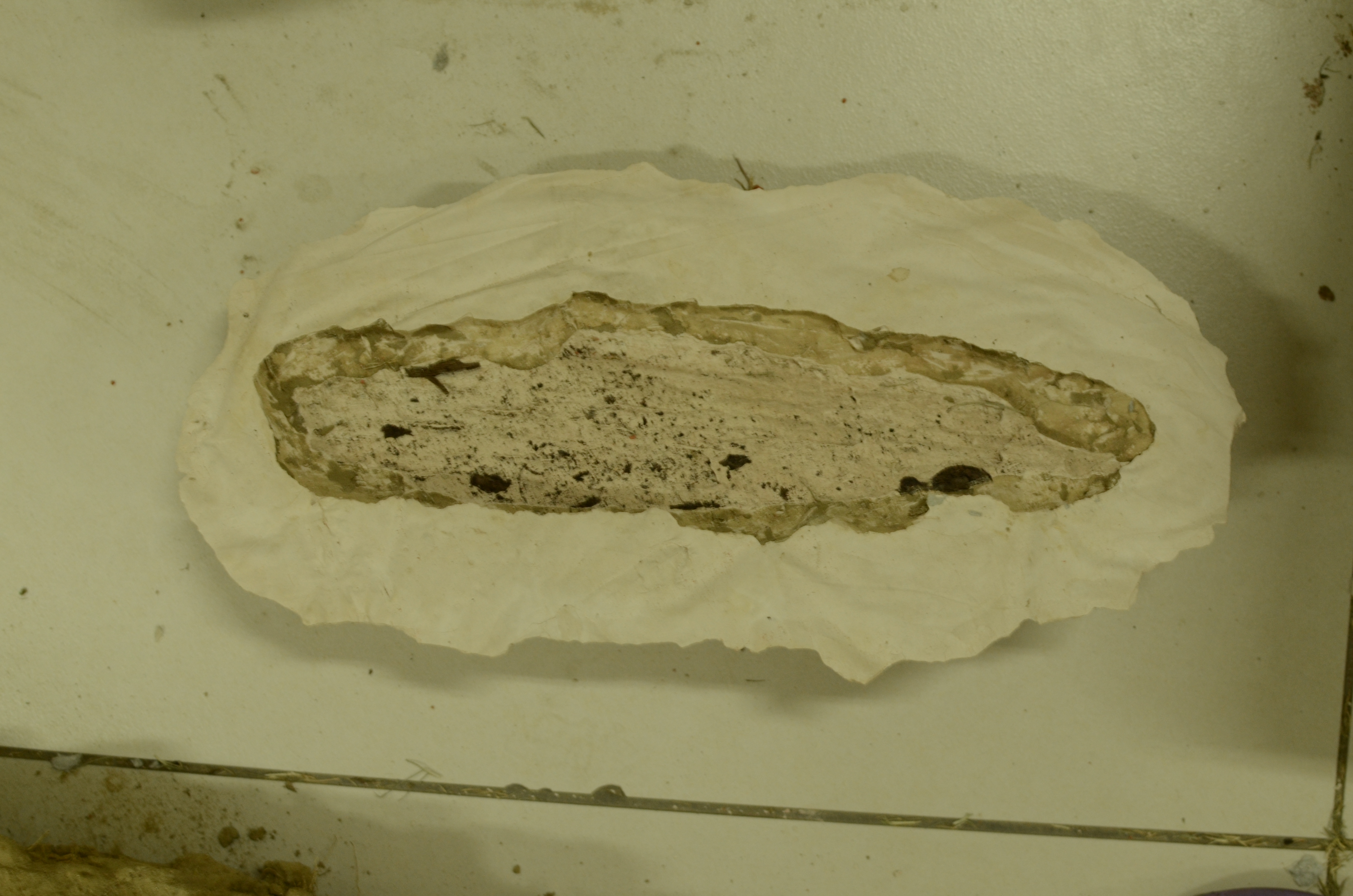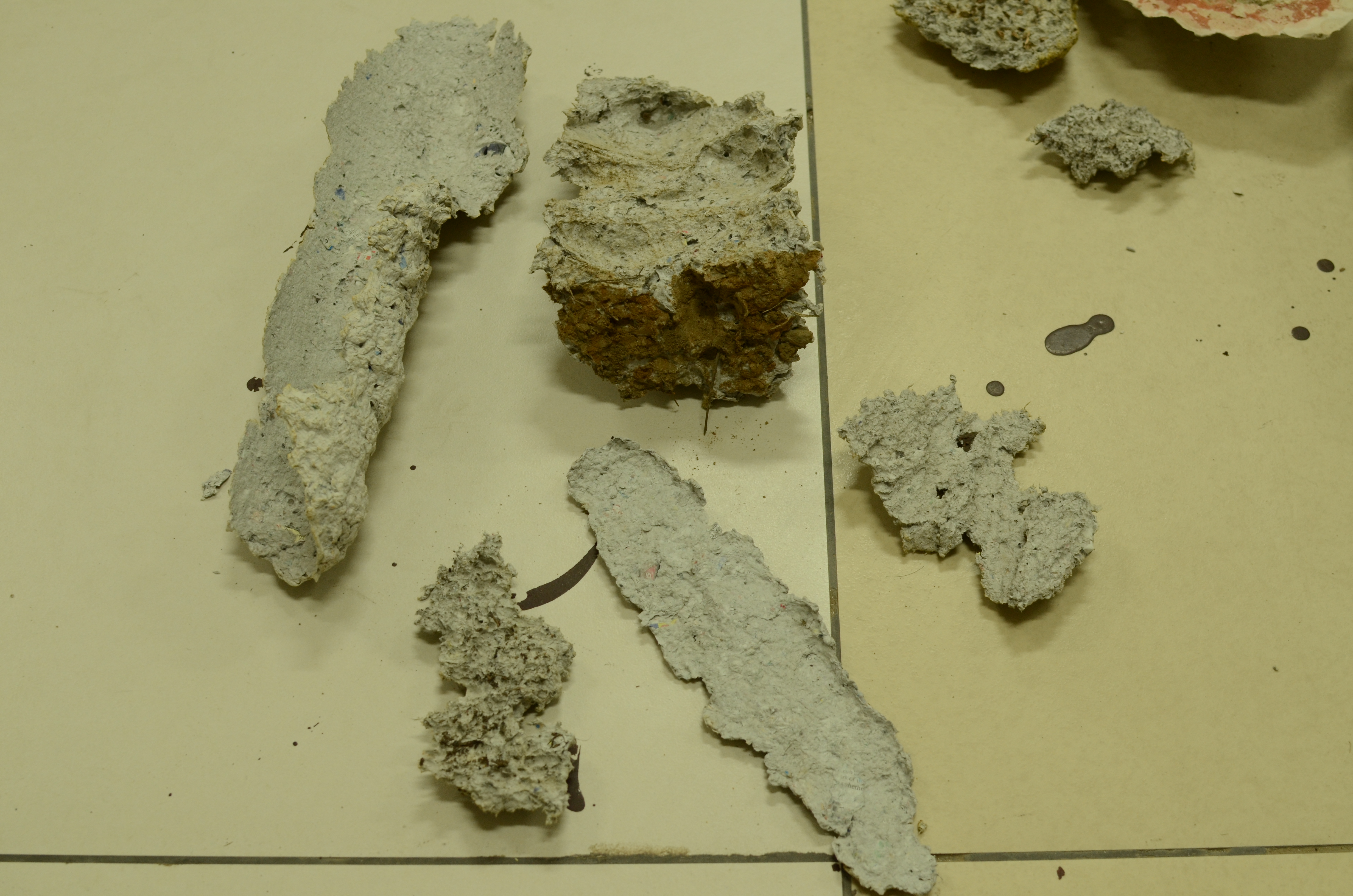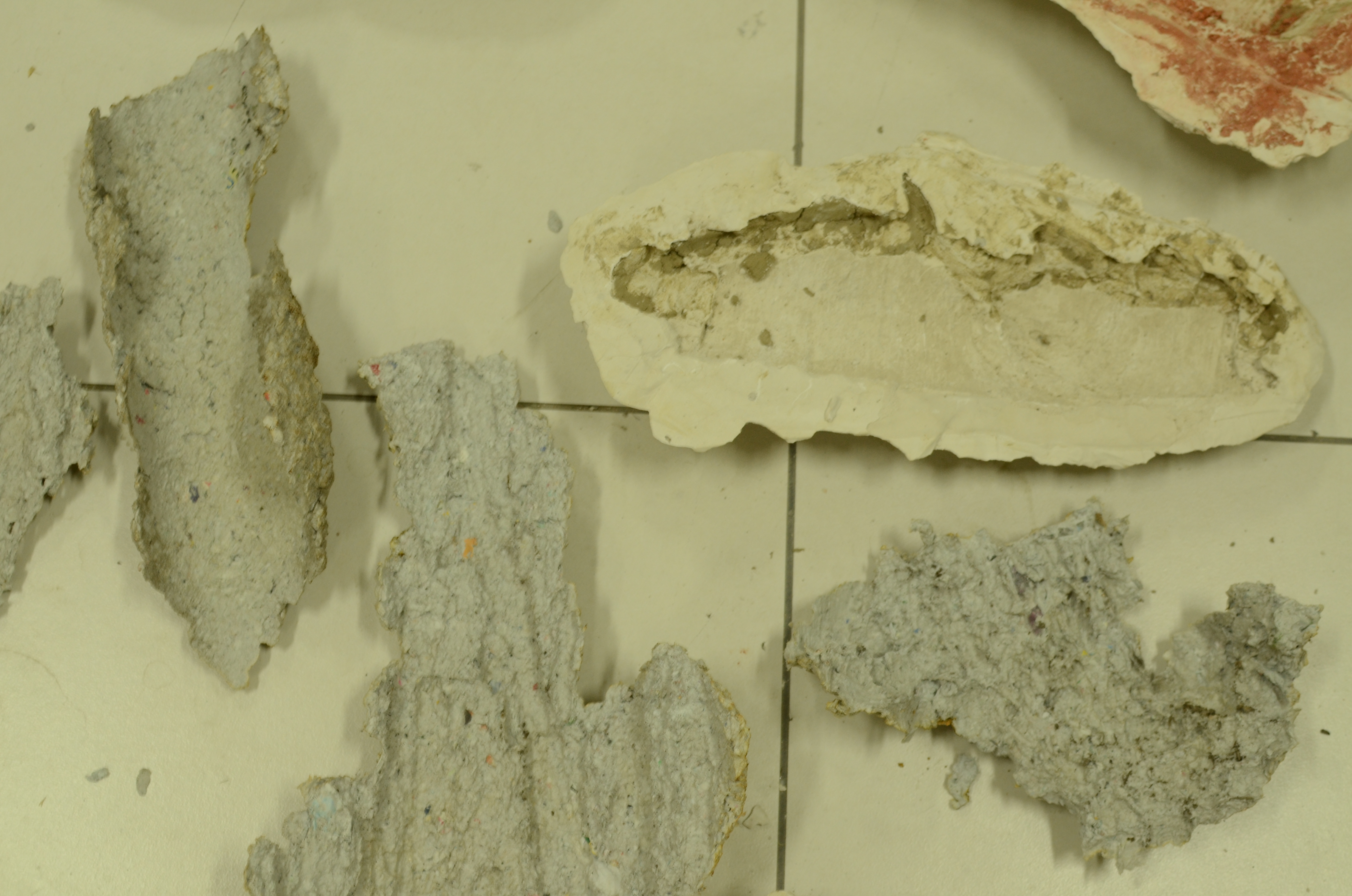 Plaster and paper maché moulds were made using tree bark found in a cemetery in Meerut, and the Shiv Nadar University campus. Parts of the bark remain embedded in some moulds to clarify the association between the imprint and its source. In one of the pieces, a block of plaster mixed with cut grass was made over a piece of cut branch that had been discarded on campus. Once the block had completely dried, it began to absorb the moisture in the branch, forming a crack. The block was cut along the crack, so that the block of wood is visibly halved.