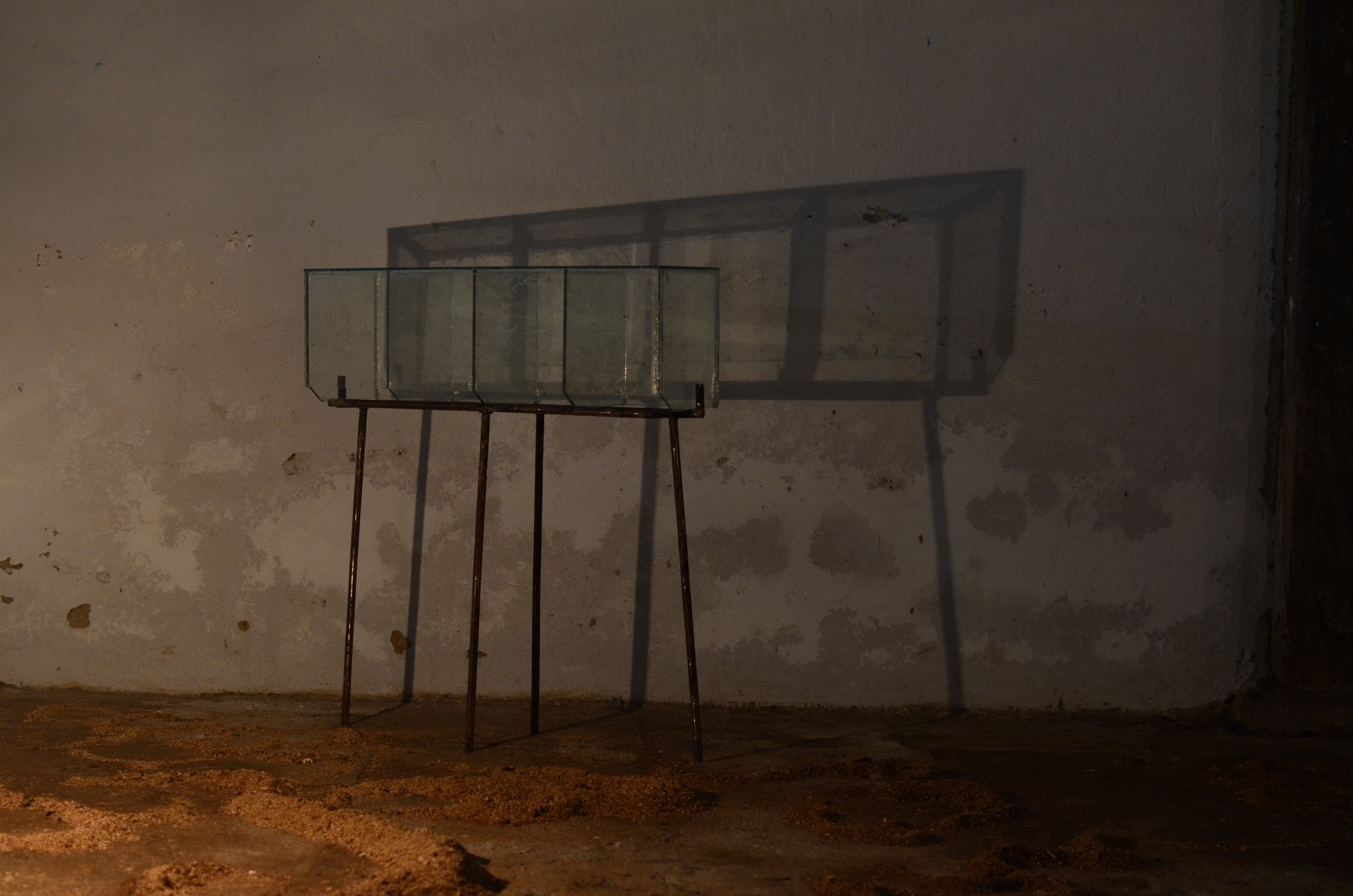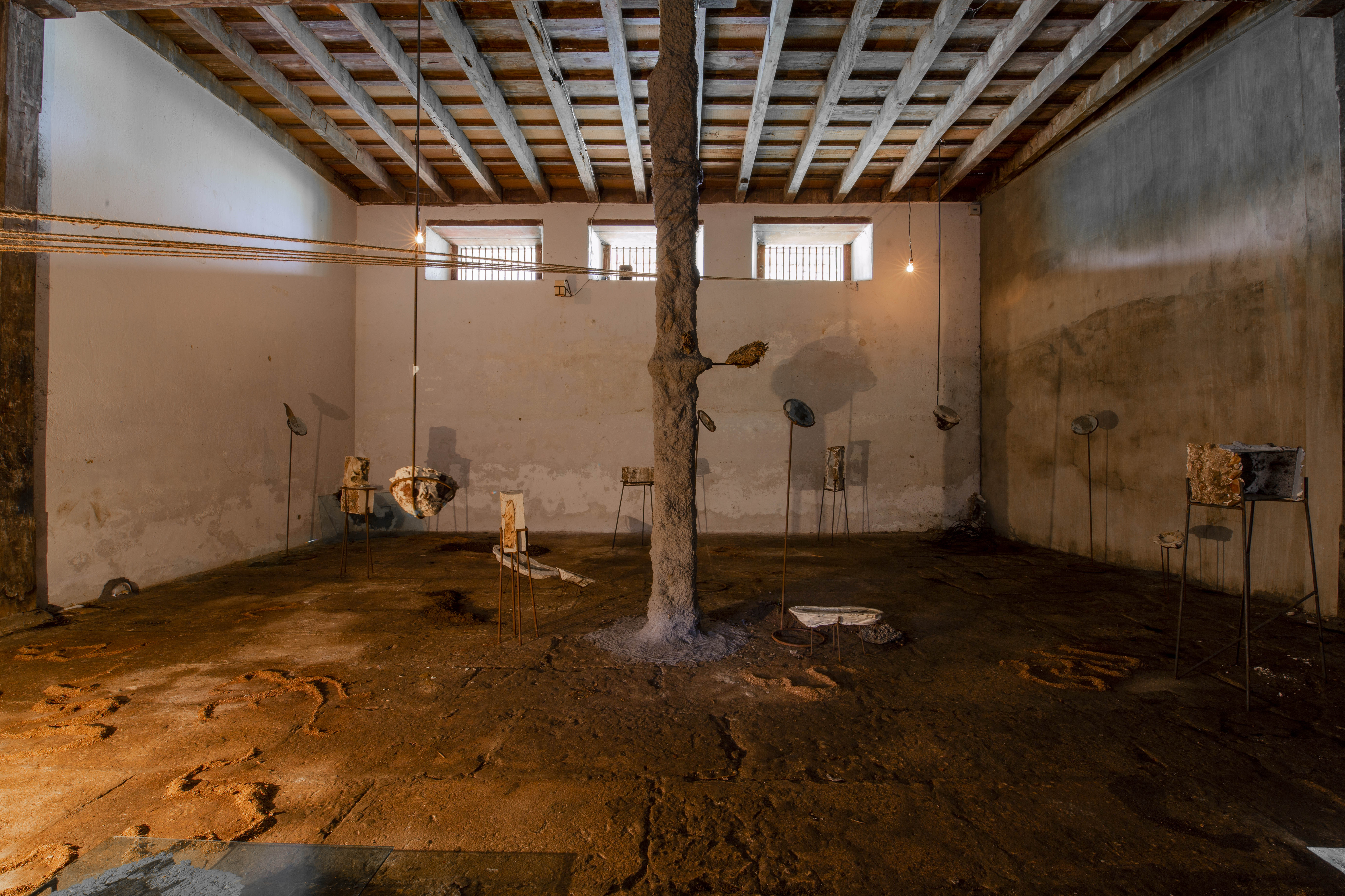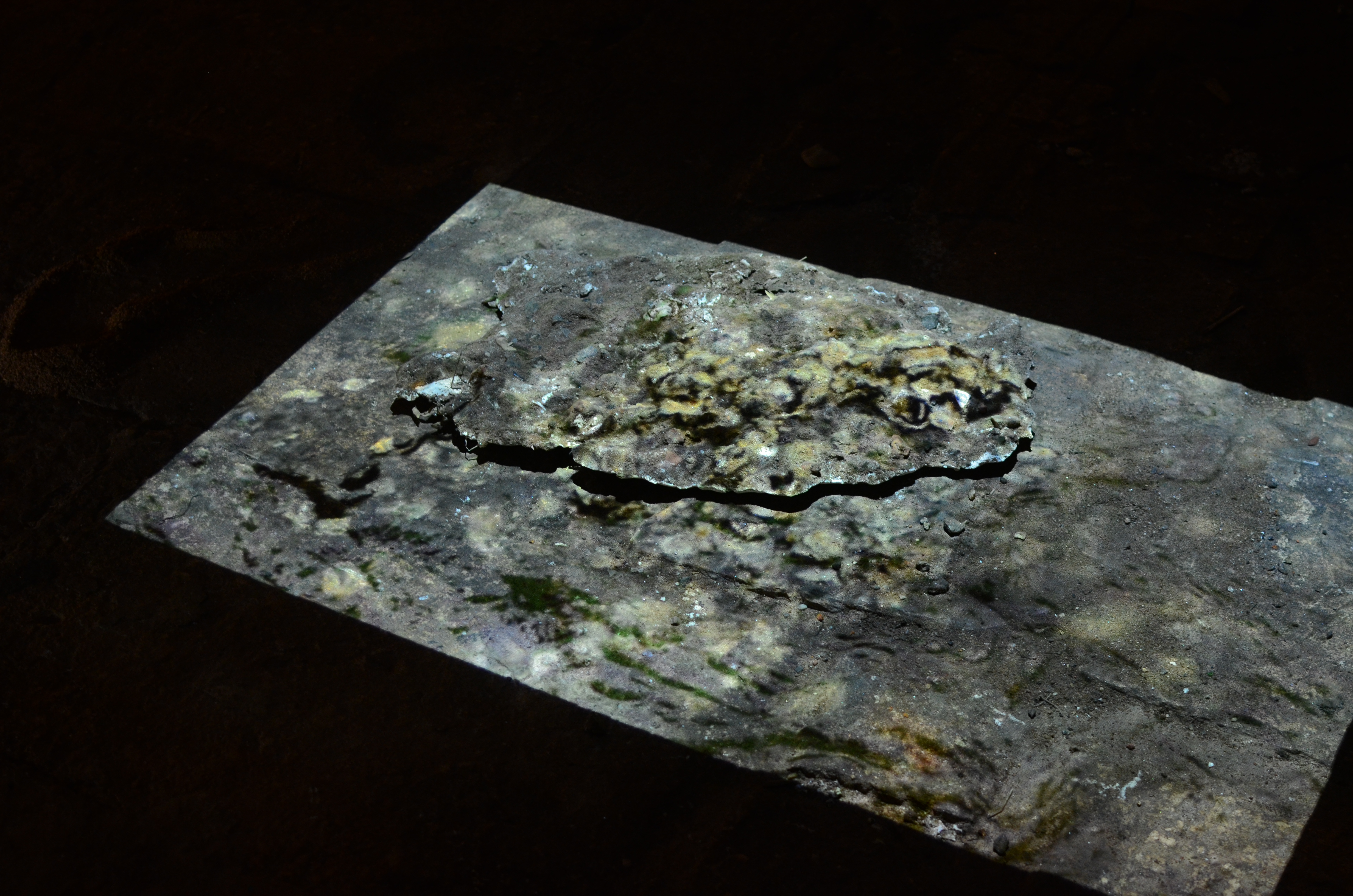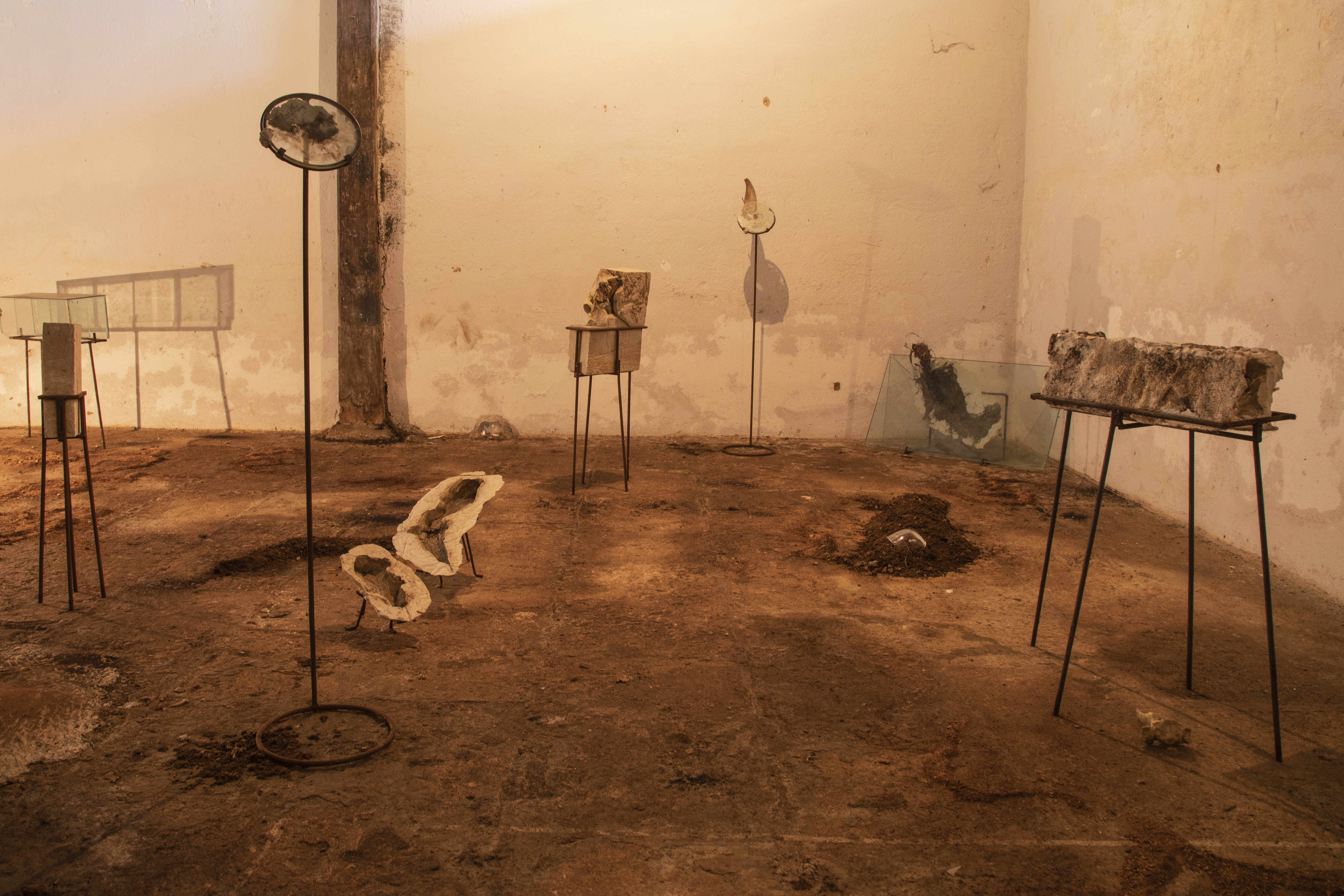 An overhead projector played a video of the water weathering a rock. This was projected on a piece of plaster placed on the floor, made by pouring plaster over the sand on the shore with shells. The pieces placed around the room are collected objects embedded in organic plaster moulds propped on iron stands.
