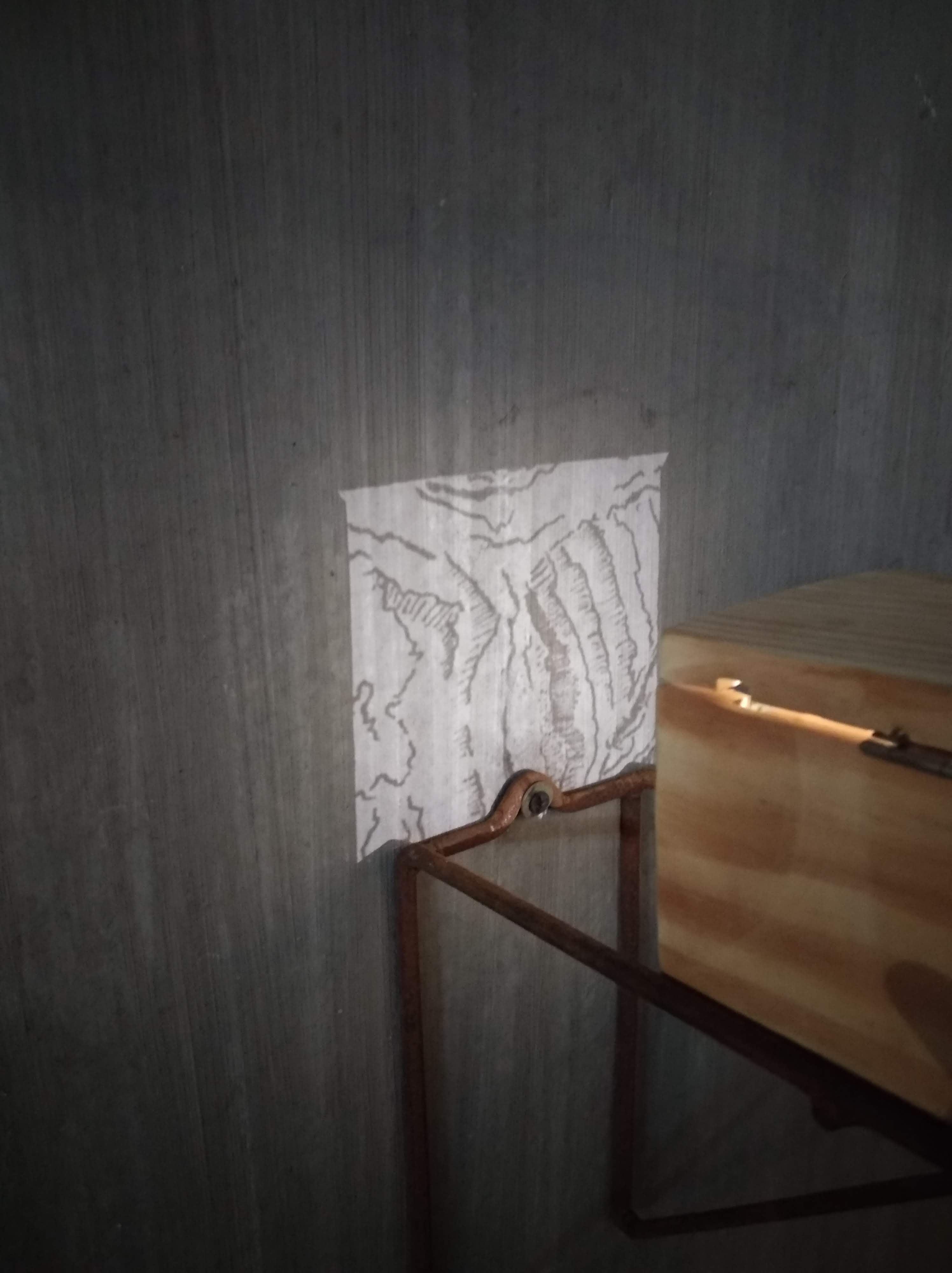 In the video, the weathered rock has accumulated shells over years of being lashed by the waves. The light box projections on the wall project shadows of drawings of the sea that were engraved on a glass surface. They are testament to the failure to draw the sea through observation, as water does not stand still.