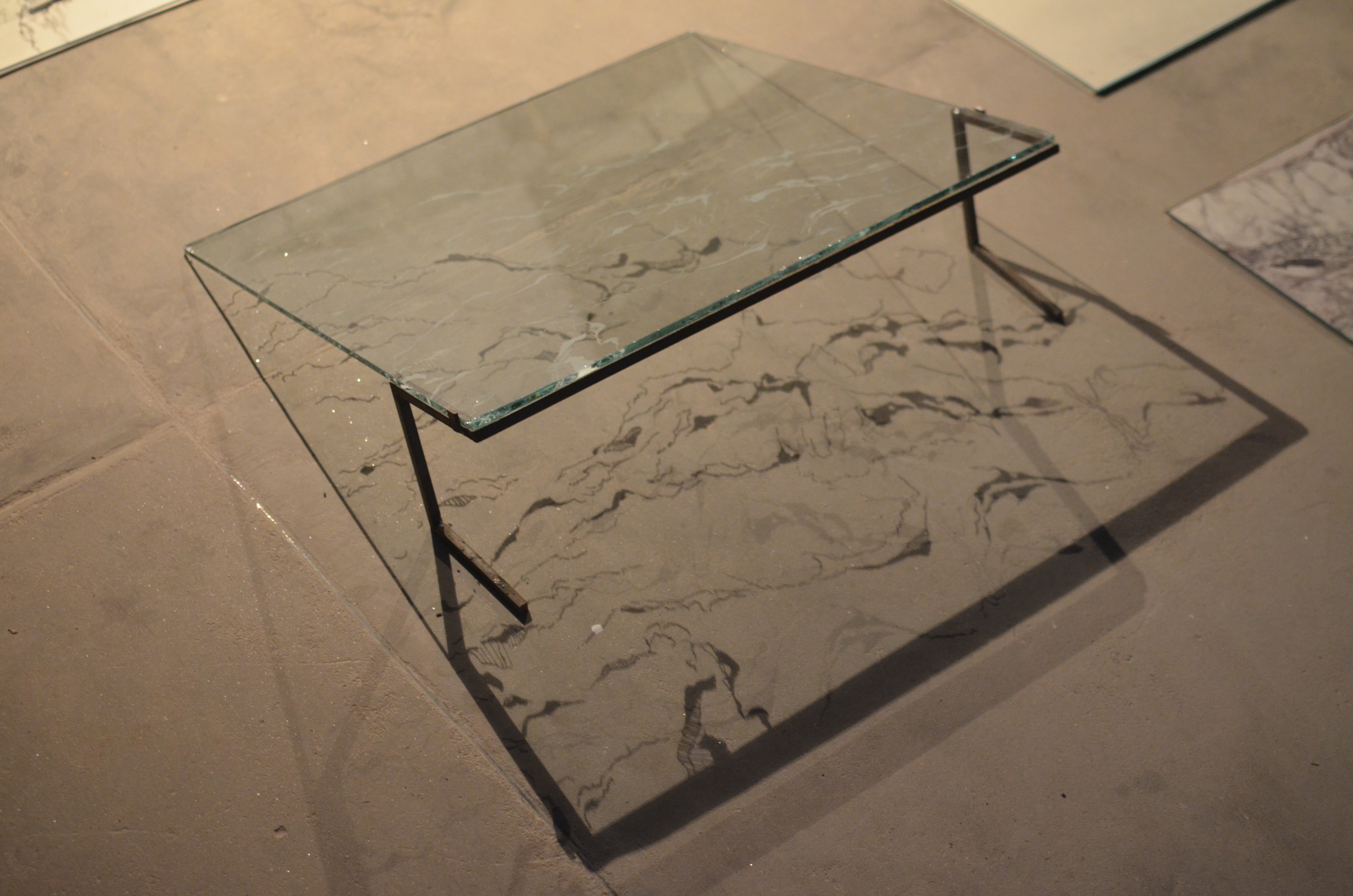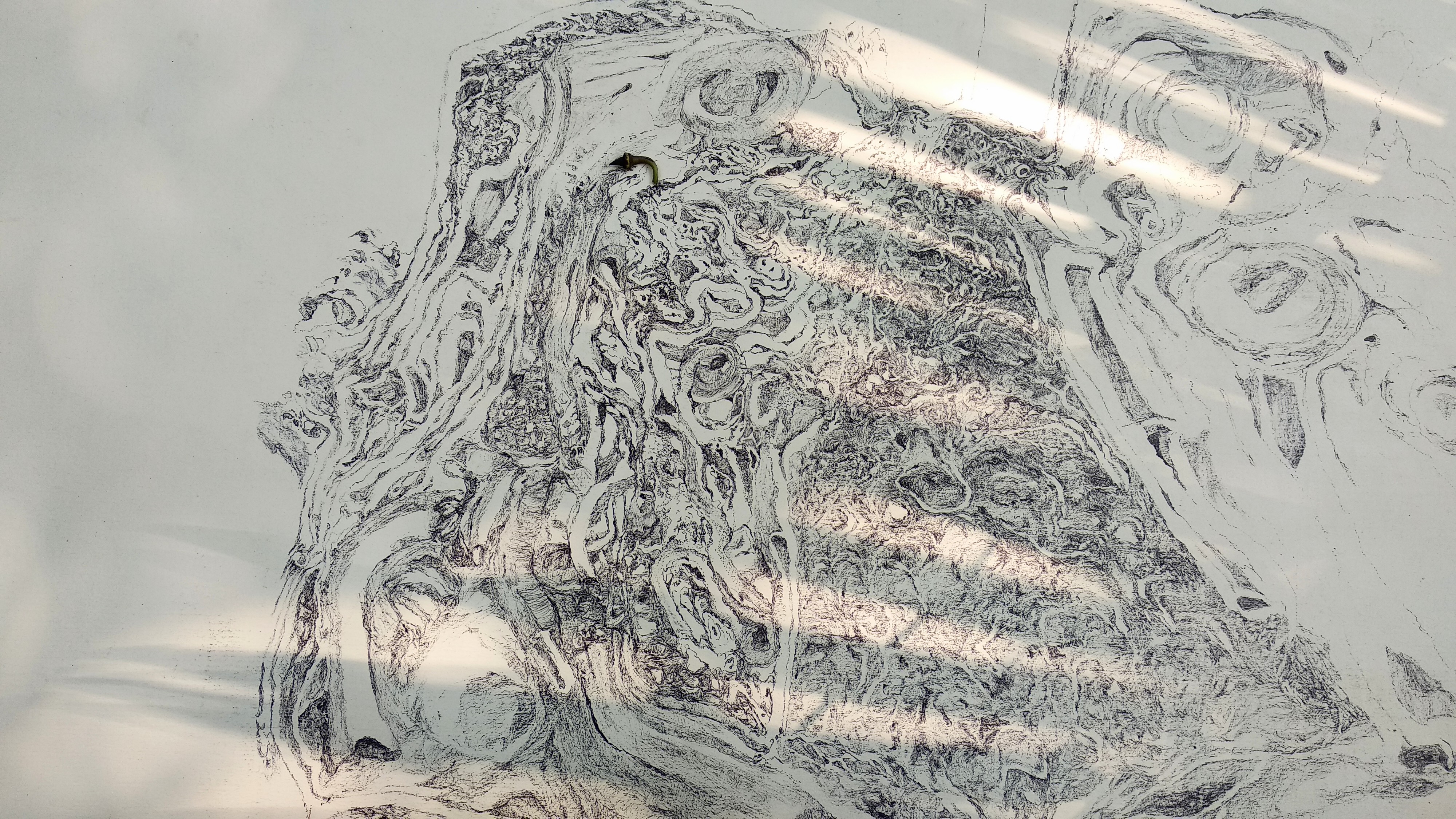 This body of work includes drawings of organic objects formed by different processes – a termite infestation, natural growth, or being weathered by the sea. Common to these objects is their deep crevices, indicated by the darkest lines in drawing. Sheets of glass with lines engraved on them are placed over the drawings, held by iron stands. These lines are cast as shadows on the drawings. The title, Skin Stretched Tight Across a Frame, Punctured, refers to a disruptive event that produces a sense of loss after a seemingly stable and prolonged mode of existence and functioning.