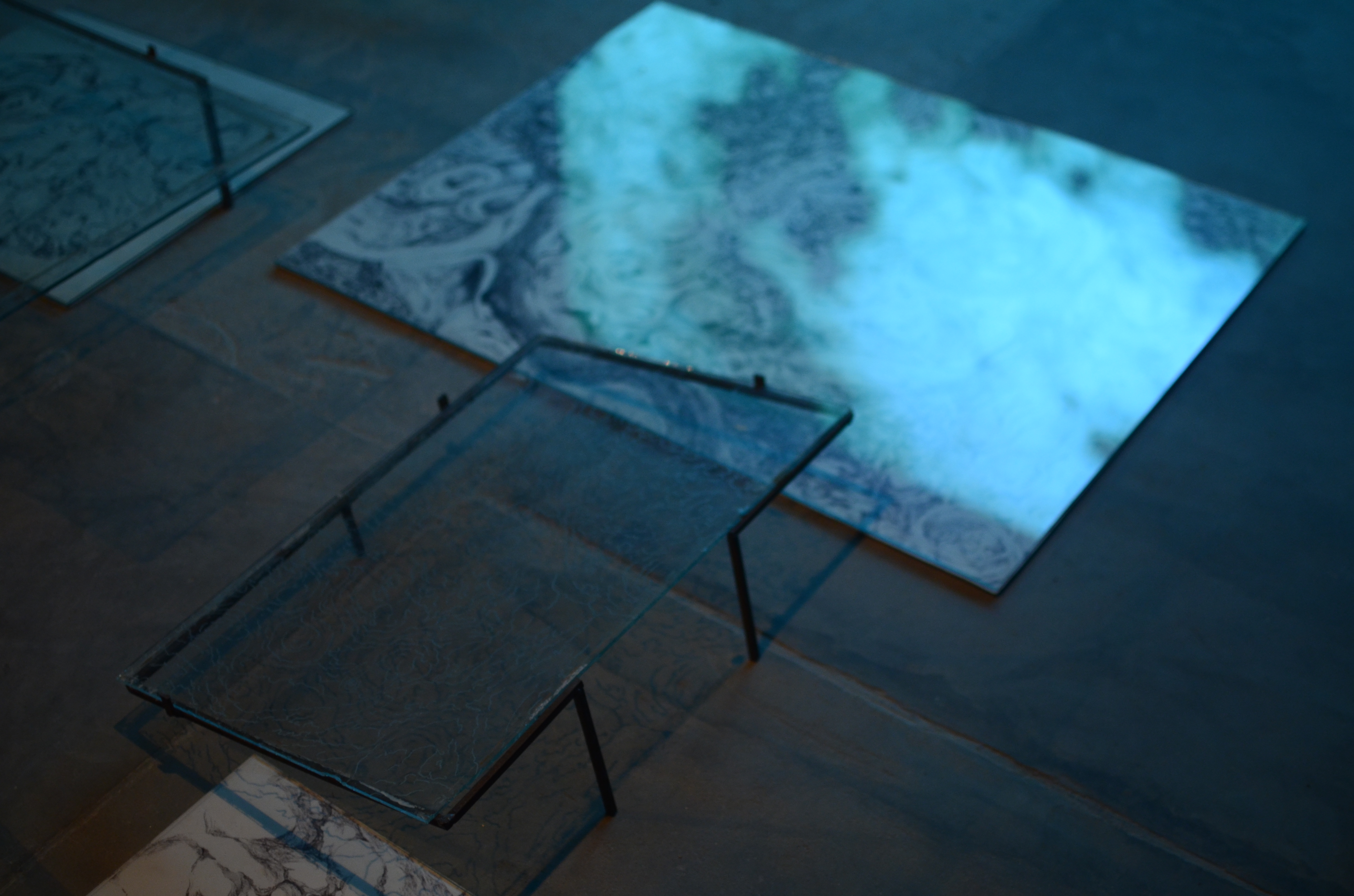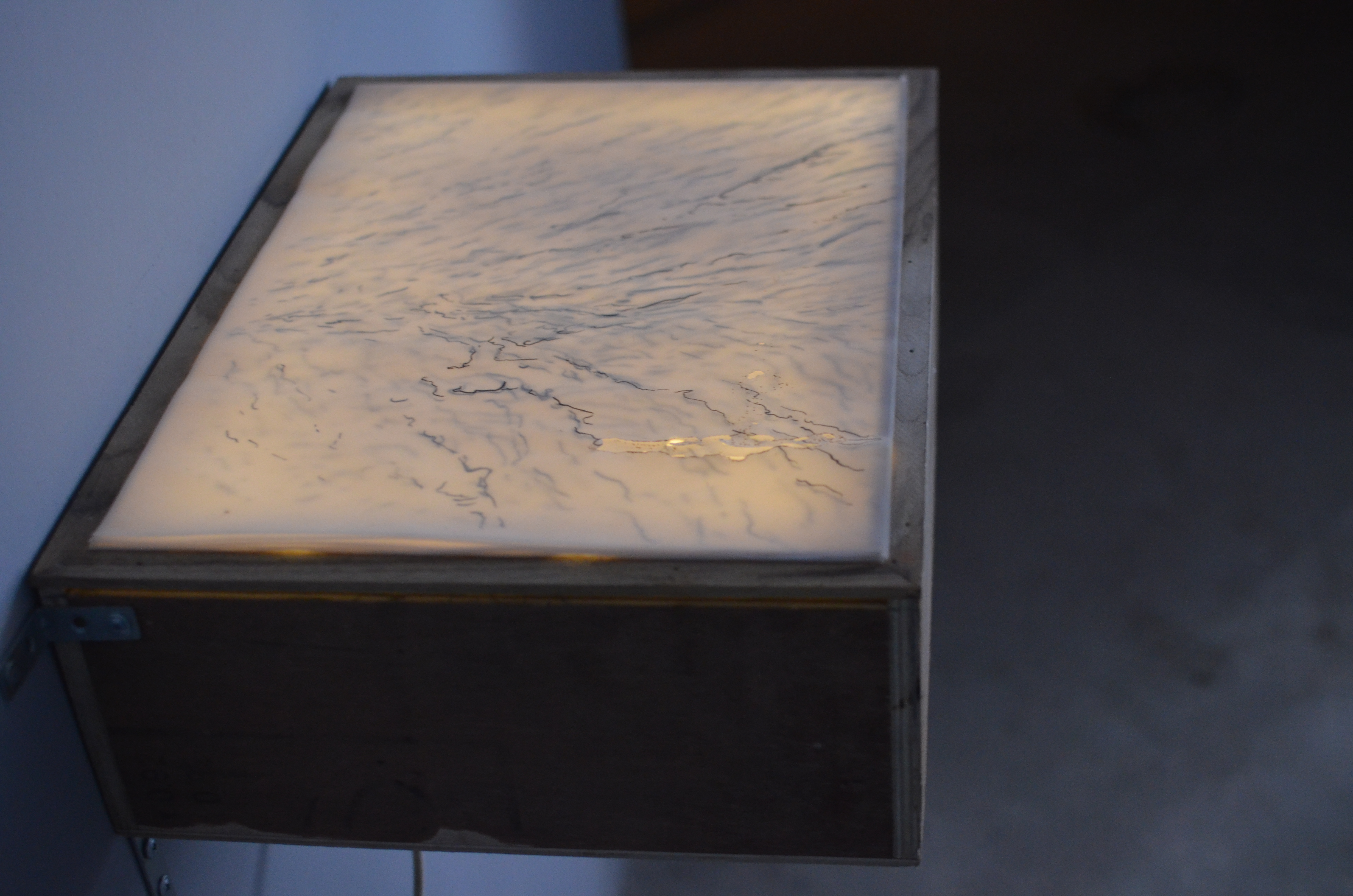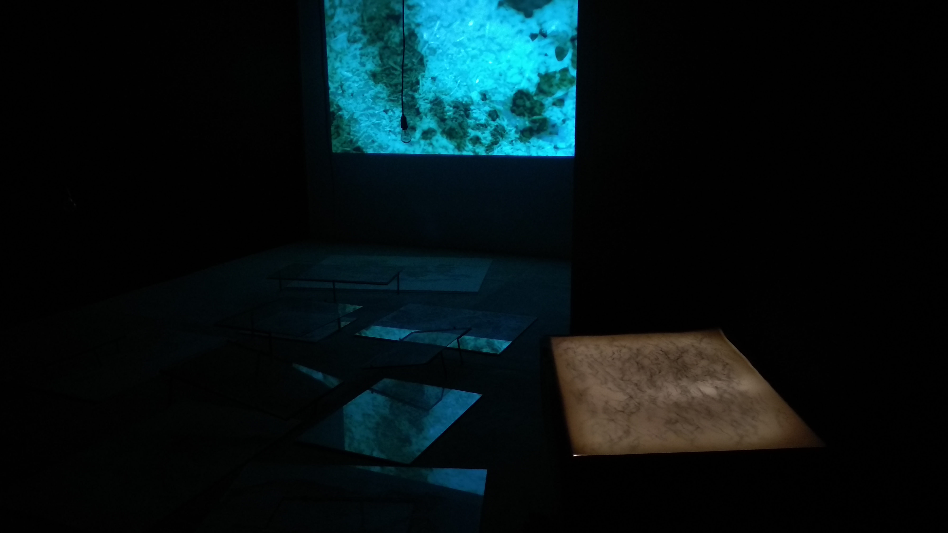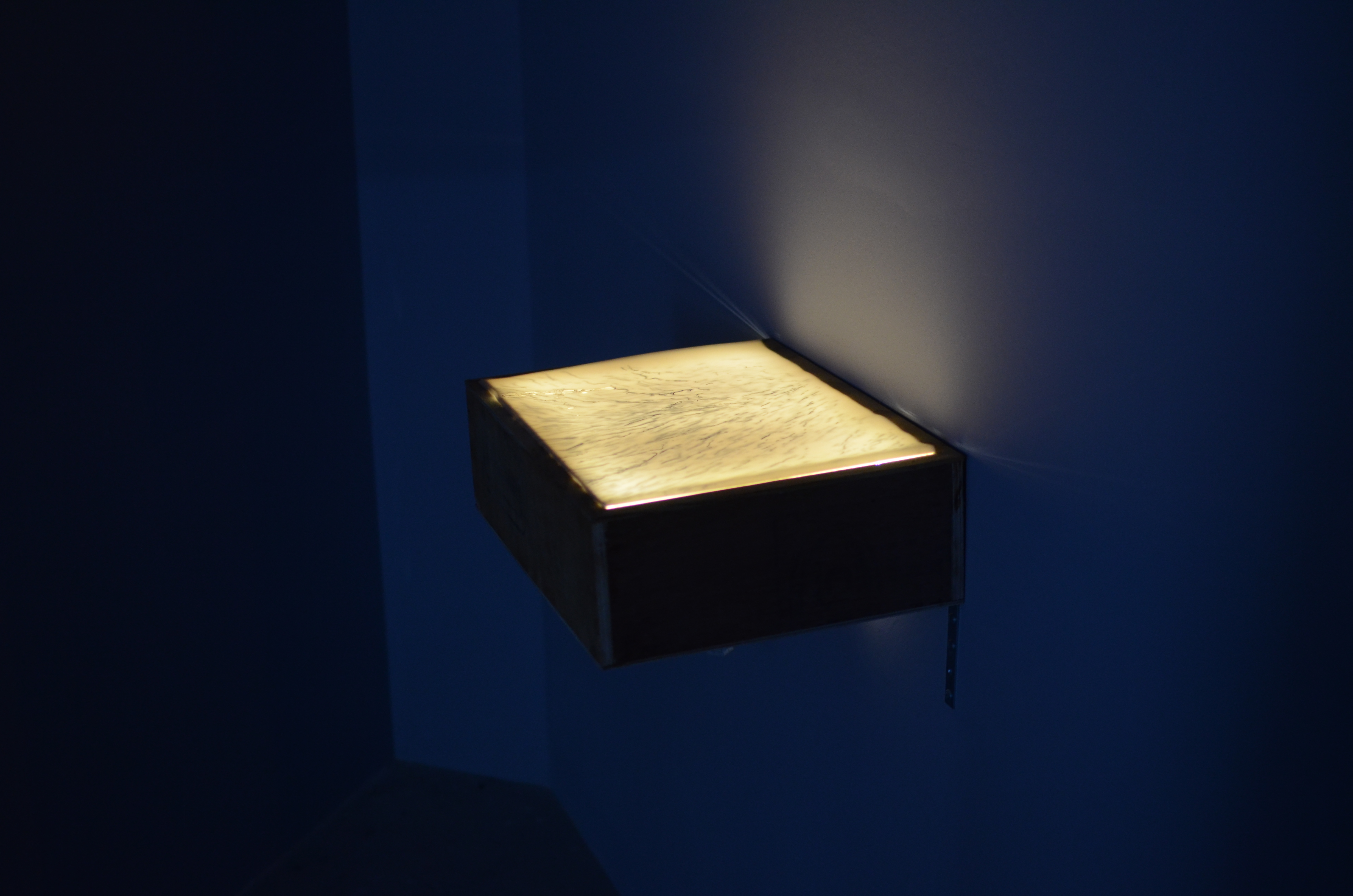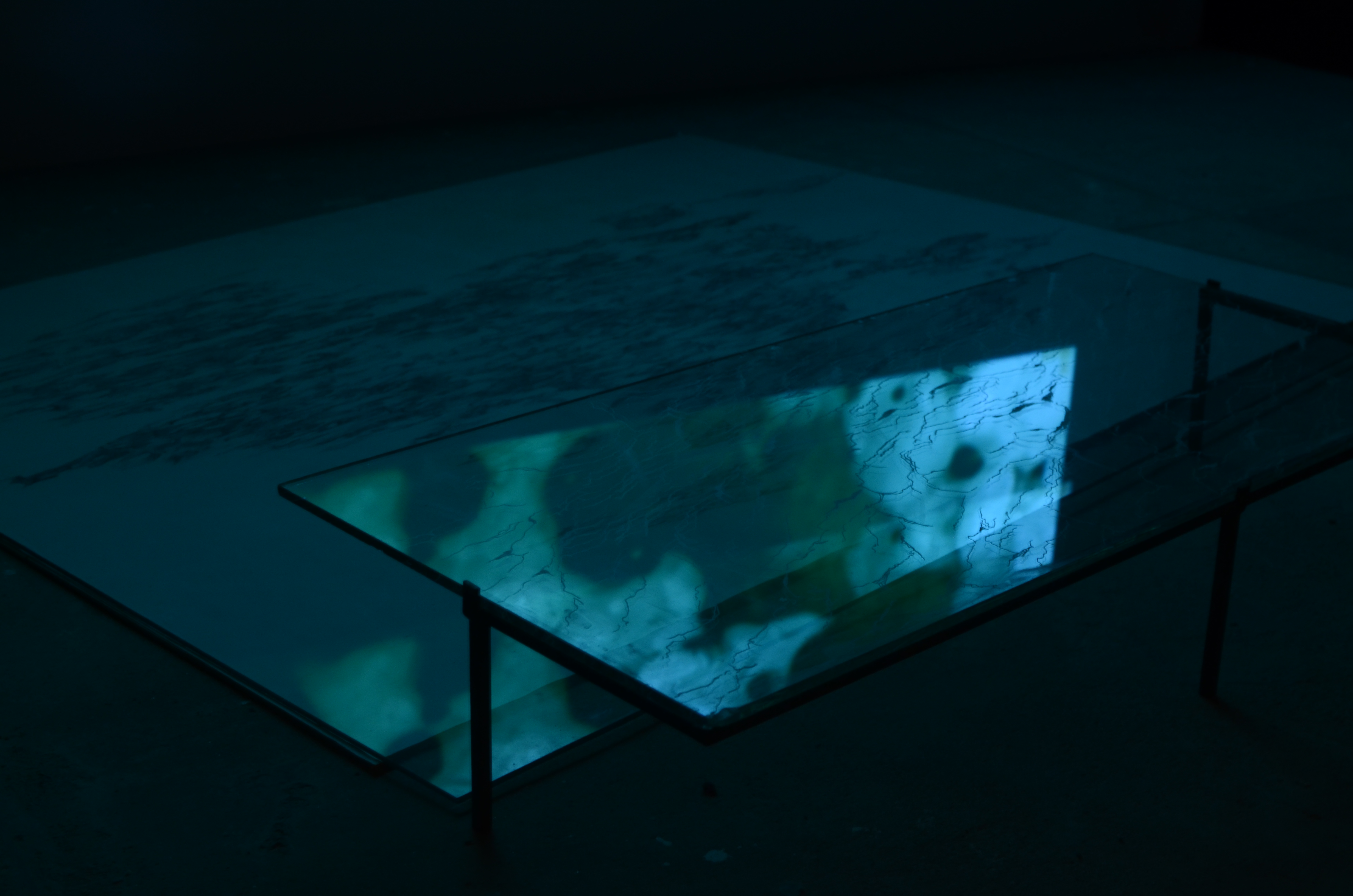 Two sets of drawings, one of the movement of the sea on a high tide over a duration of 7 minutes, the other of a termite infestation on a dead mushroom, are placed on light boxes to reveal the layers of time and depth that make up both processes. The video projection, Light Threads the Tunnel/Forgetting uses footage of materials mixing, merging, or melting into one another, interspersed with visuals of light, breath and water.